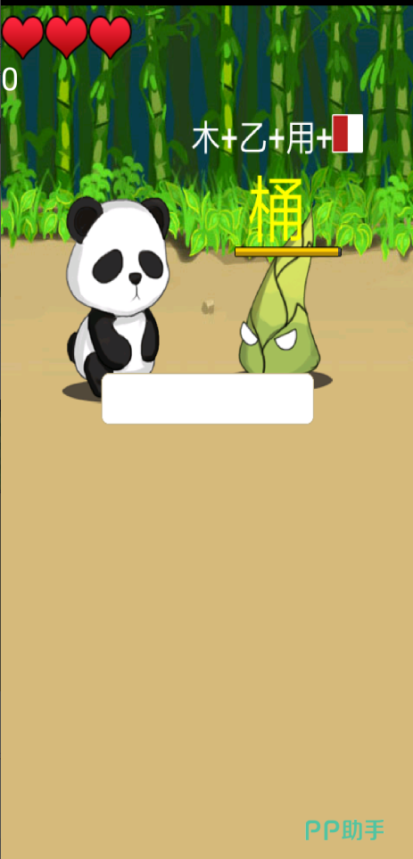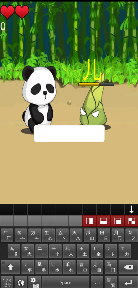 八八王这款游戏玩法并不难,玩家进入游戏点击开始按钮后就发现屏幕中出现了一直熊猫,熊猫头顶上有三个小心心,对面有个竹笋,竹笋头上有有一个字,字的下方有一个倒计时时间条,那就明白了,玩家要在规定时间内将出现的字快速并正确的打出来,然后熊猫就会攻击竹笋,没有打出来或者打错了竹笋就会攻击熊猫。
