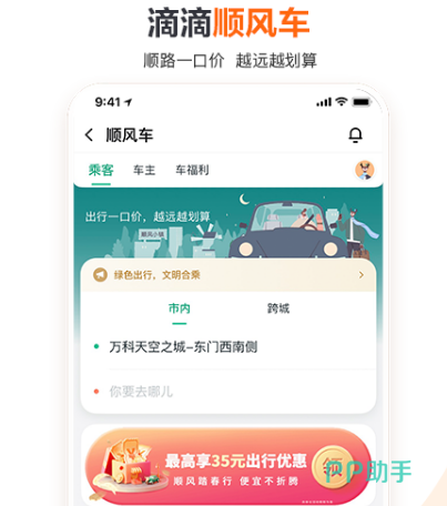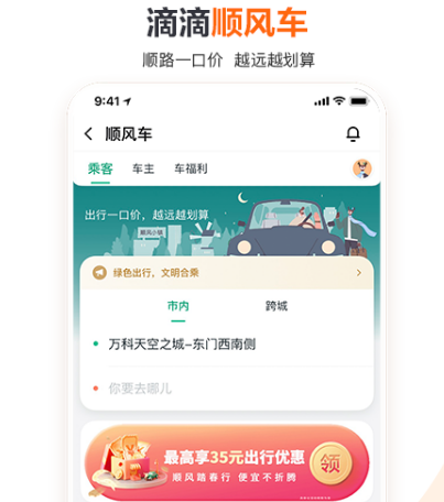 如今很多城市都在推崇绿色出行,因此各种顺风车软件以及网约车软件纷纷出现为大家推荐的顺风车这一款打车软件一直都有着较高的知名度,是很多小伙伴都在使用的。不仅可以在所在的城市里叫到车,同时还能进行长途拼车,便捷又舒适,具有跨城出行服务。致力于为大家提供安全舒适便捷的出行服务,即便雨雪天也不会过多加价。