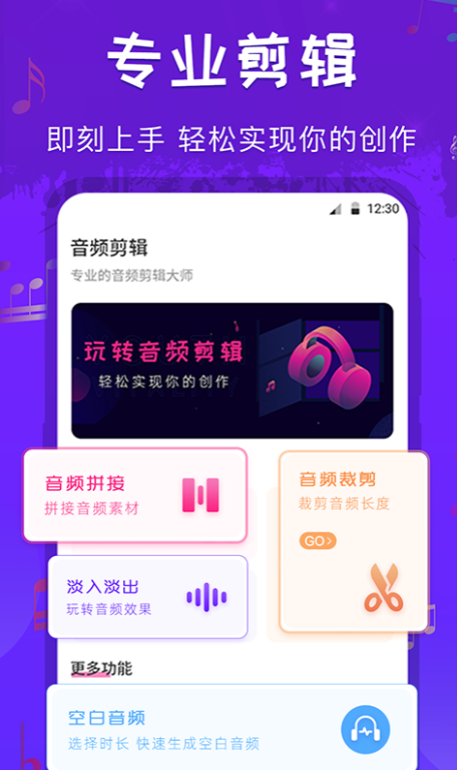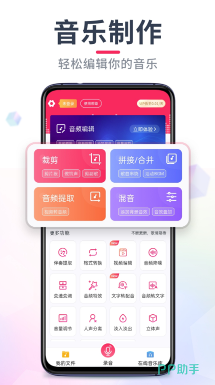 你可以使用该软件对音频进行包括提取、裁剪、混音等一系列的操作以完成对音频的编辑,除了能编辑自己需要编辑的音频或者用来练习的音频素材以外,你还可以在该软件中的在线音乐库下载更多地音频来编辑,以锻炼提高自己的编辑音频能力,不断学习。