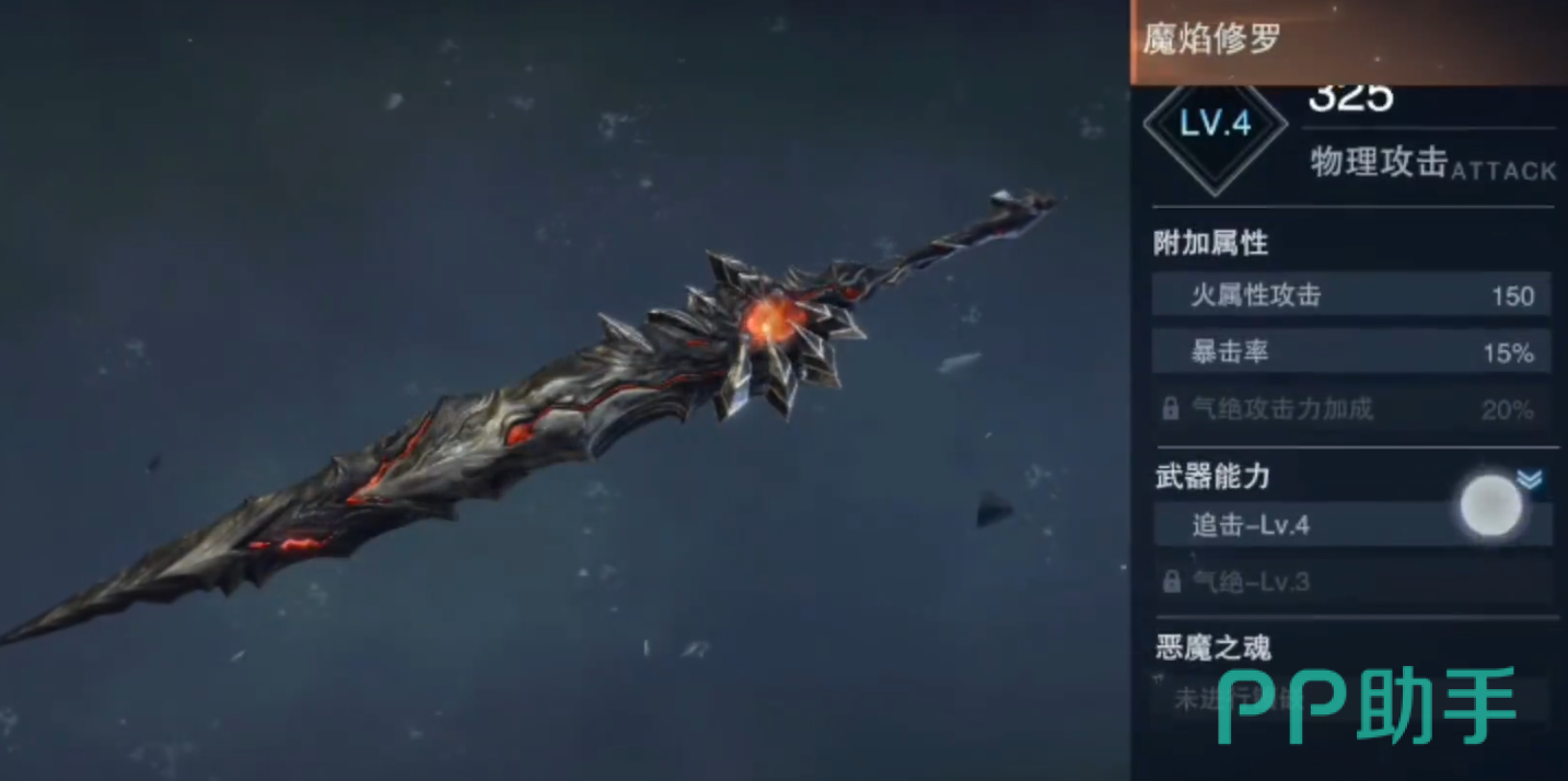 关于武器的排行,首先就是剑系武器的排行,剑系武器目前来有两把排名靠前的武器,第一把叫做魔焰修罗、第二把叫做罪魂凝光。首先是第一把武器魔焰修罗,这是一把火属性的武器,在四级的时候就拥有高达325点物理攻击力的面板,150火属性攻击的面板和15%的暴击率,除此之外,当这把武器达到了5级之后还能解锁一个气绝20%攻击力加成的词条,这一套词条的属性加成让这把武器的属性面板达到了夸张的地步。