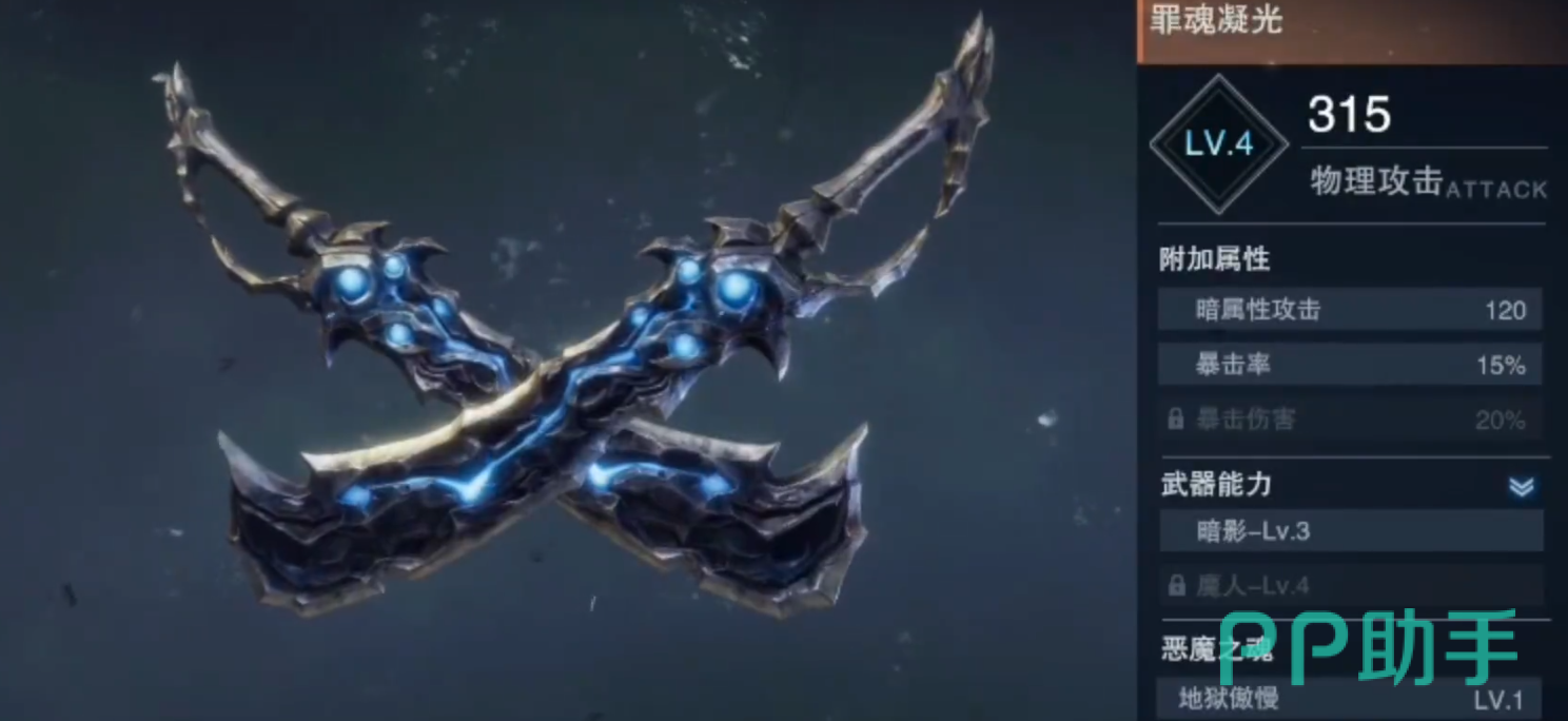 之后是排名第二的武器罪魂凝光,这把武器虽然是剑系武器但是外形却完全不像是剑修武器,而是更像一把双刀武器,该武器在4级强化的时候拥有315的攻击力、120的暗属性攻击力和15%的暴击率,光看这些属性的话它其实是比较一般的,但是这把武器在强化5级之后会发生质变,这个质变就是该武器在5级的时候会解锁一个20%暴击伤害的词条,这个词条瞬间改变了这把武器的强度,让这把武器来带了武器排名第二的位置,可以说这把武器的强度绝大多数是来源于这20%的爆伤属性。