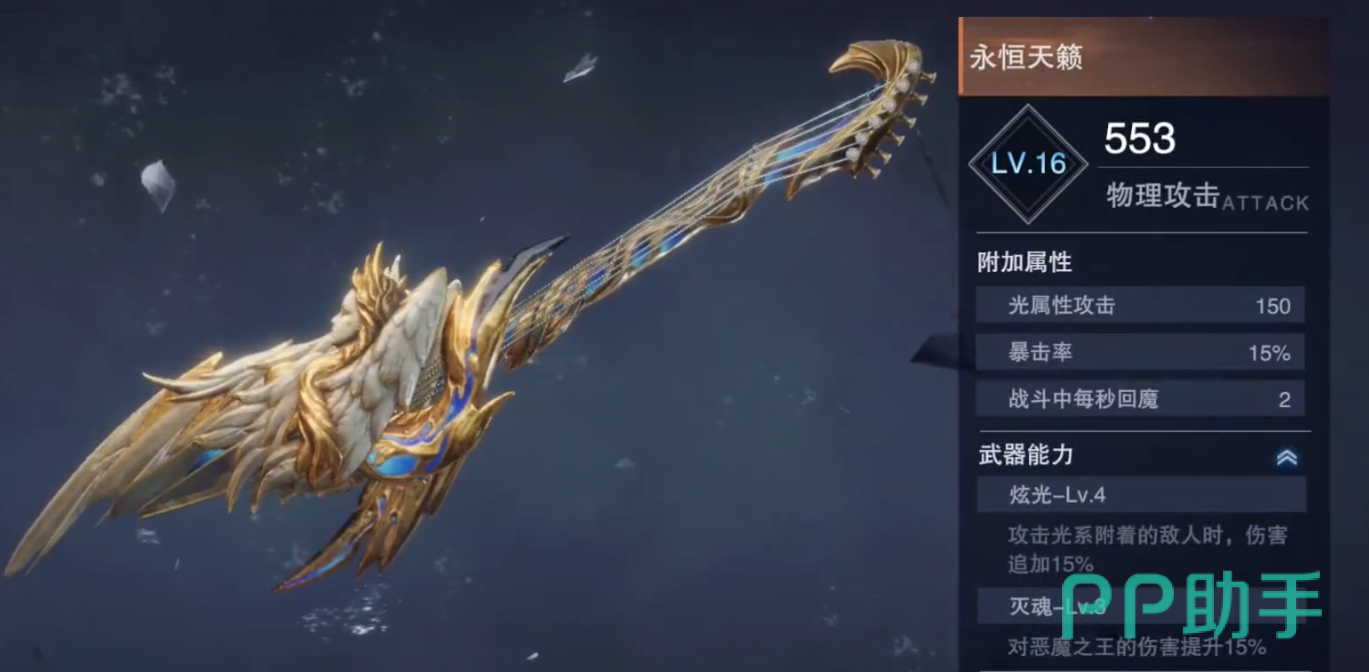 再之后是排名第三的武器也是最后一把推荐的武器,这把武器很特殊它是一把吉他造成的武器,该武器叫做永恒天籁,该武器在5级的时候就有将近400的物理攻击力,另外它还有225光属性攻击加成、30%的暴击率加成和每秒恢复7点蓝量这三个词条,这三个词条的属性效果不管是哪一个都是很棒的,除此之外它的武器能力也是顶级。