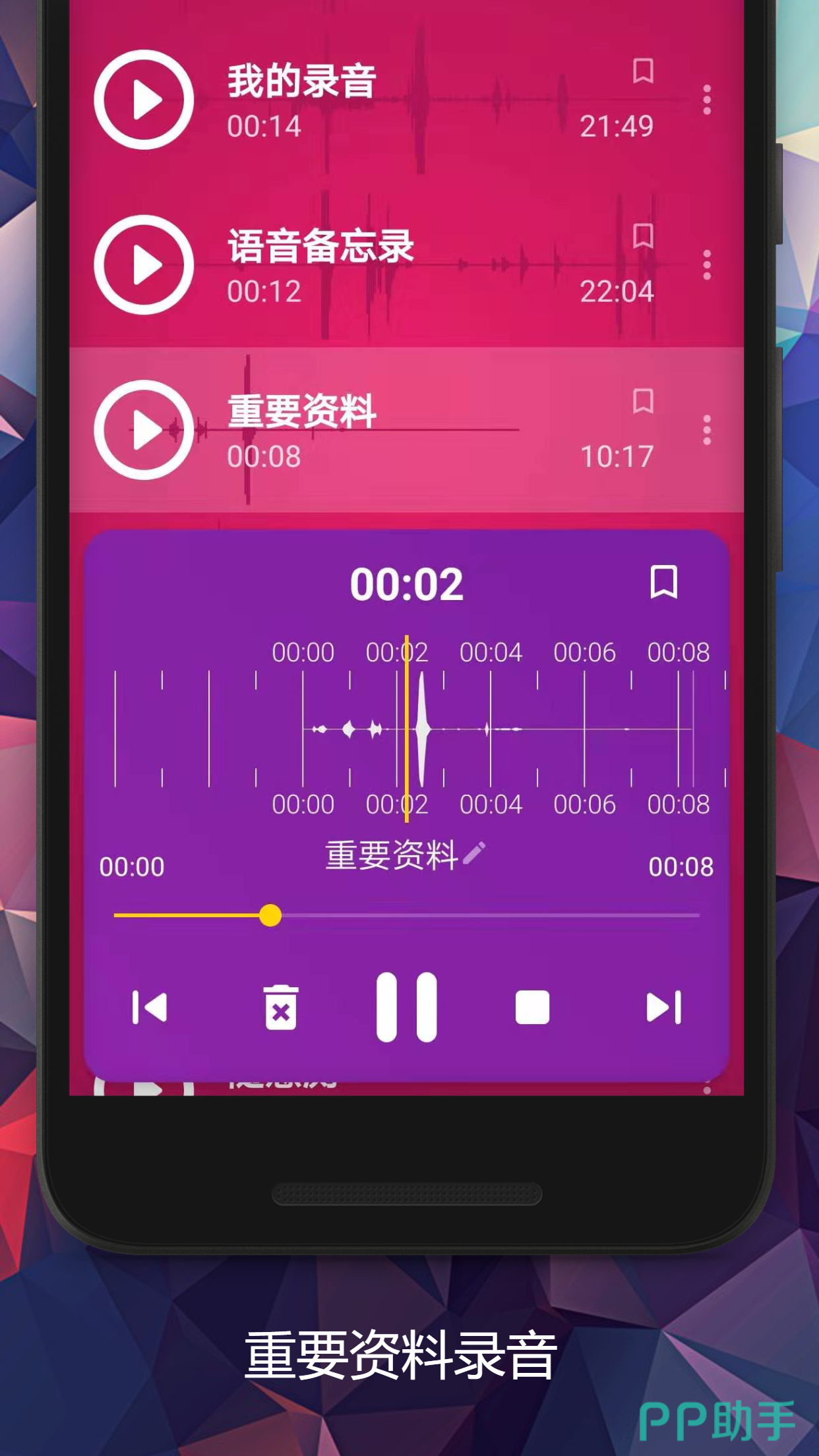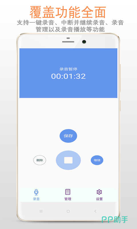 它是一款小巧而且简洁的实用性极高的录音工具。一键启动录音,省电省内存,功能强大,没有后台自启动,不会偷流量,不盗窃隐私,不耗内存。适用于各种恶劣环境,不知道,音效品质高,具有很广泛的适用性。而且在手机锁屏中也不会中断录音,实现了随时随地的记录。