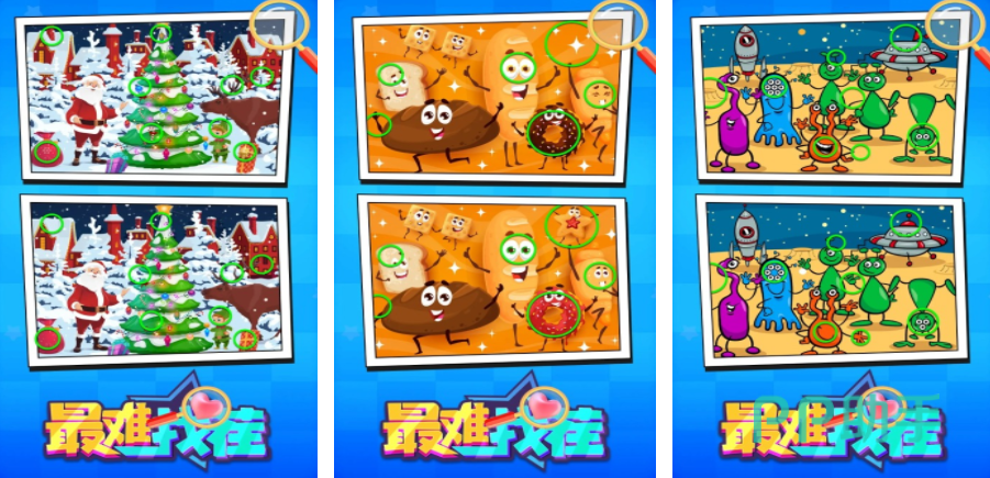 这是一款很难找到的游戏,关卡很多,而且每一关的场景和主题都不一样,要找出两张照片中的不同之处,虽然看起来并不是很难,但其实难度很大,有一些不同的地方差异很小,只是角度或者颜色上面的细微区别,这就需要玩家有足够的耐心去寻找,而且游戏里面设置了很生动及有趣的场景,能够给玩家更愉快的体验。