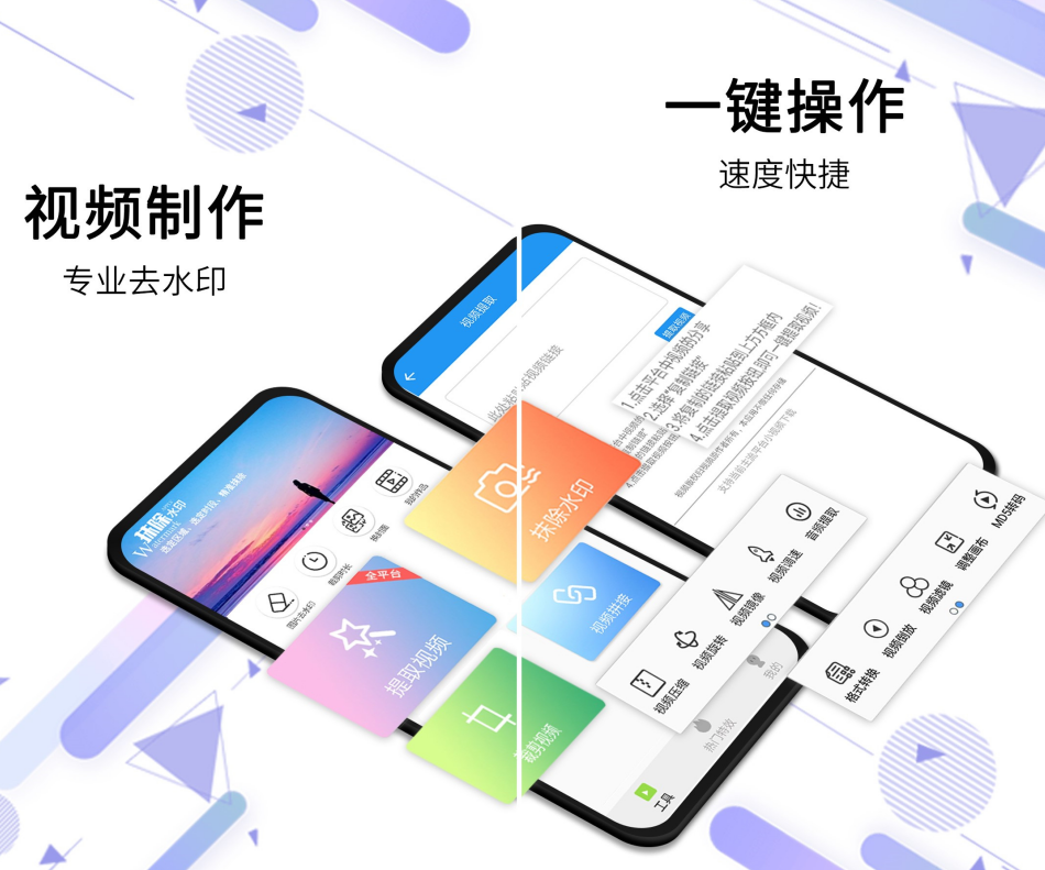 这是一款支持视频一键去水印的文件处理app,用户只需要涂抹水印位置,就可以无痕去除水印。软件提供了视频剪辑功能,可以自动提取并解析用户上传的视频,将多段视频进行拼接,并提供了倒放、旋转、镜像等炫酷转场效果。此外用户可以调节操作框,选定自己想要的画面,将不需要的区域留在操作框外侧,即可剪辑出想要的视频画面和效果。