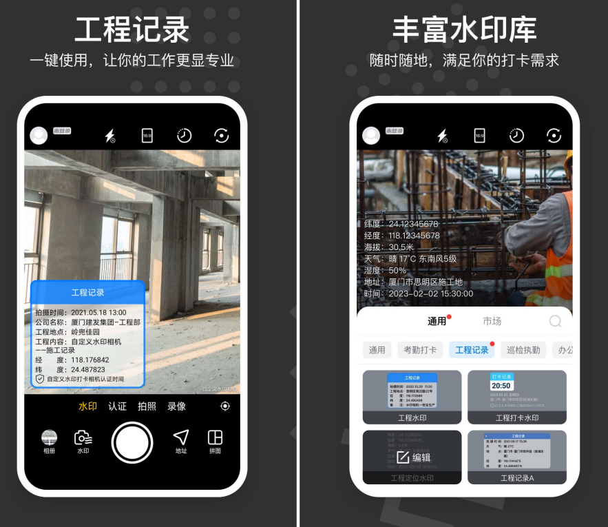 这是一款支持添加时间地点等水印的相机app,软件支持定时定位拍照,自定义地点、经纬度、时间等,可以为批量图片或视频添加水印,免去了用户一个一个手动添加的麻烦,一键添加更快速方便。此外用户还可以添加工程记录和海拔等,帮助做工程的用户外勤记录工作内容。