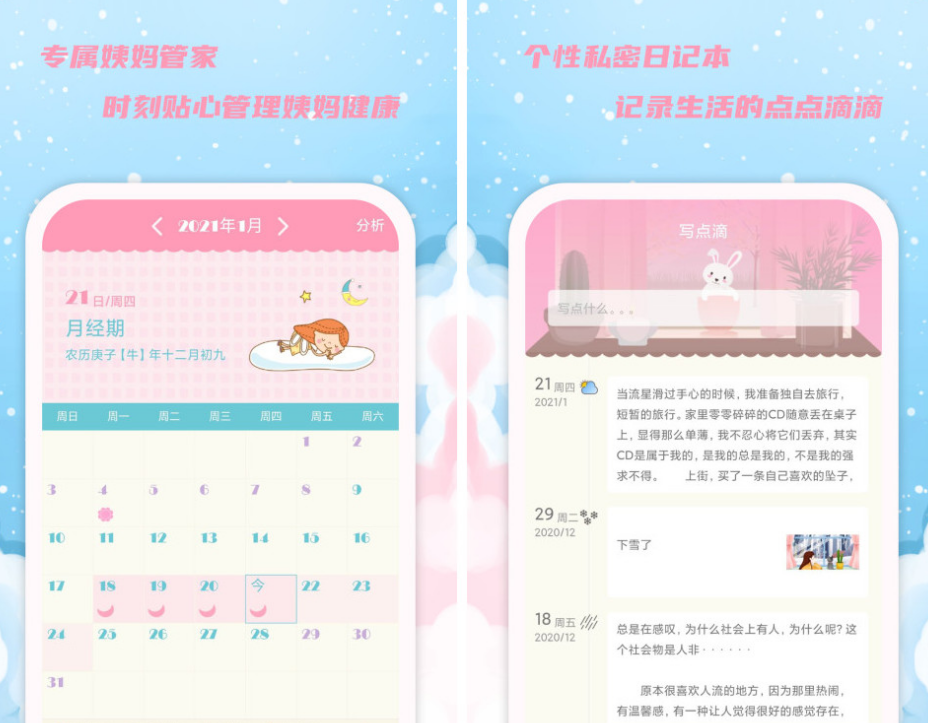 这款软件界面简洁Q萌,功能实用简单,能够帮助各位小仙女们全方位管理自己的生活。软件提供生理期日历功能,帮助用户记录并预测生理期。软件还拥有写日记功能,用户可以记录今天的心情与天气等,让点滴的日常成为回忆。此外软件还可以记录用户的收支情况,健康管理财务,帮助用户成为理财小能手。