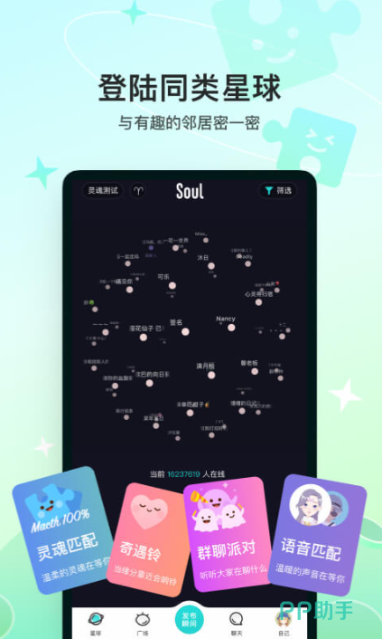 这个软件的主要功能有很多,其中最强大的就是灵魂鉴定功能,也就是一个小测试,基于双方的性格和三观,让双方更加契合。本软件的神奇之处就在于可以在虚拟的社交关系里培养一种真实感在这里,大家不用面对现实中的压力,纯粹是由于兴趣走到一起,可以和朋友们自由的敞开心扉,找到自己的好友。