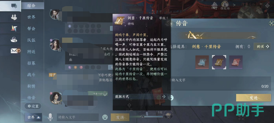 同样的,如果与其他玩家产生了什么江湖恩怨,也可以利用它向世界喊话,从而获得其他玩家提供的线索。使用千里传音的具体步骤就是打开世界频道,然后点击右下角的传音图标,之后再选择“千里传音”这个道具即可。