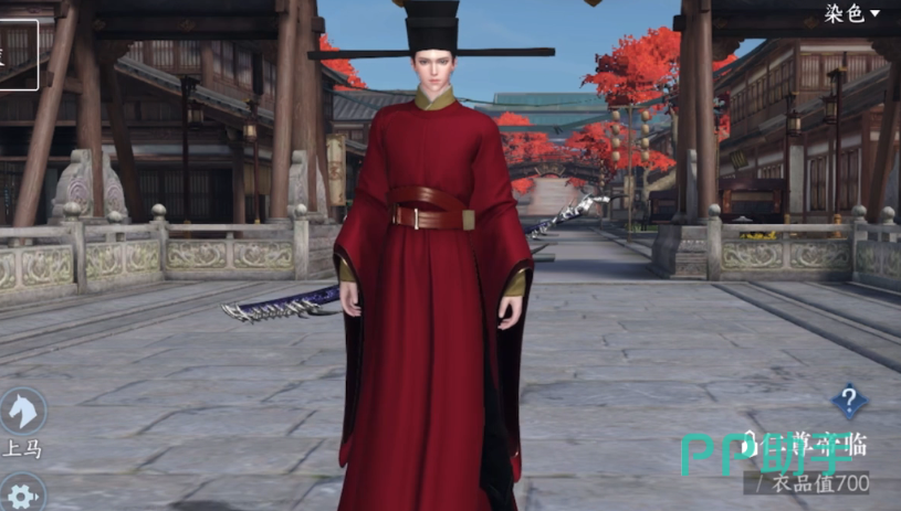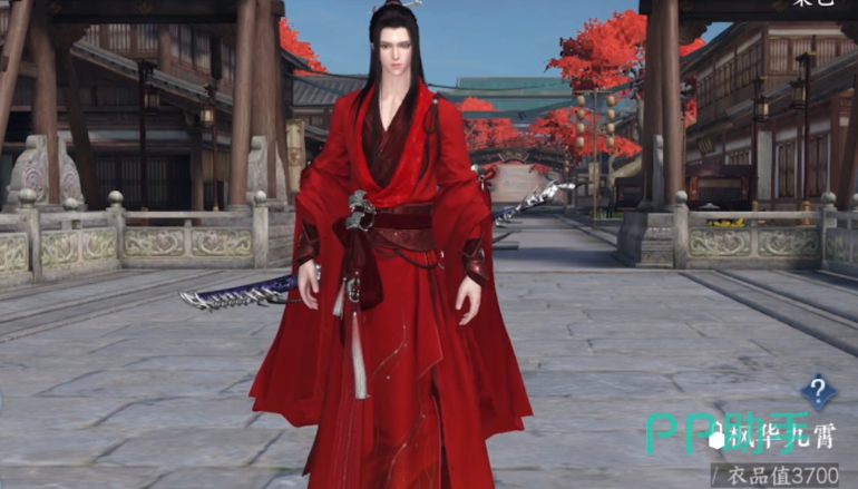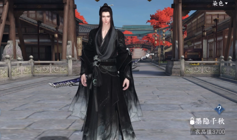 枫华九霄,一身红看着像是喜装,大红的外披加上深红带点黑的内衬,手腕和腰间还有绑绳,这套需要3680玉购买。然后就是墨隐千秋,这个游戏里男性时装一般纯色的会比较好看,比如前面纯红的,或者这里的纯黑的。