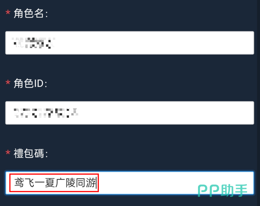 点击此处的兑换码就会跳转到一个新的网页,在这里要输入你的游戏名,也就是“代号七个字”那时候填写的名字,当然并不是一定要七个字, 然后是角色ID,这个在个人界面也是能看到的,最后就是兑换码了。