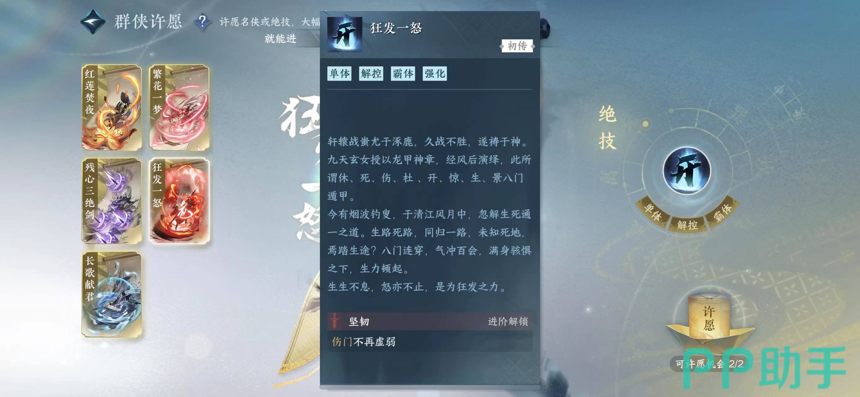 狂发一怒:其进阶效果是坚韧,可以让伤门不再虚弱,这一效果的说明虽然十分简洁,但作用在实战中确实让角色本身增加了许多的容错,一些必败的局面也有了翻盘的可能。