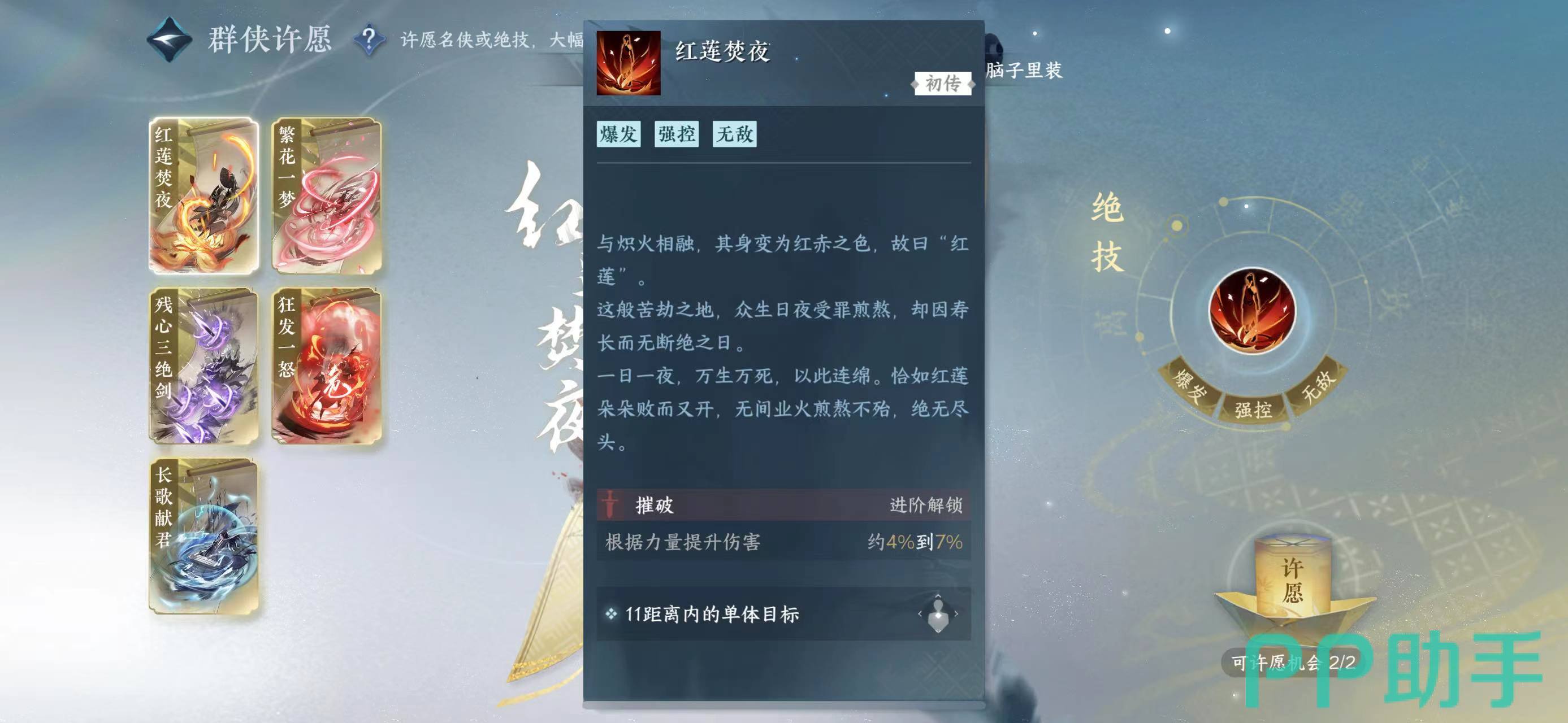 红莲焚夜:它的进阶效果是“摧破”,能够根据力量来提升4%~7%的伤害,算是和神行同类型的技能,不过力量本身也可以加攻击,所以它相对来说会更加如虎添翼。