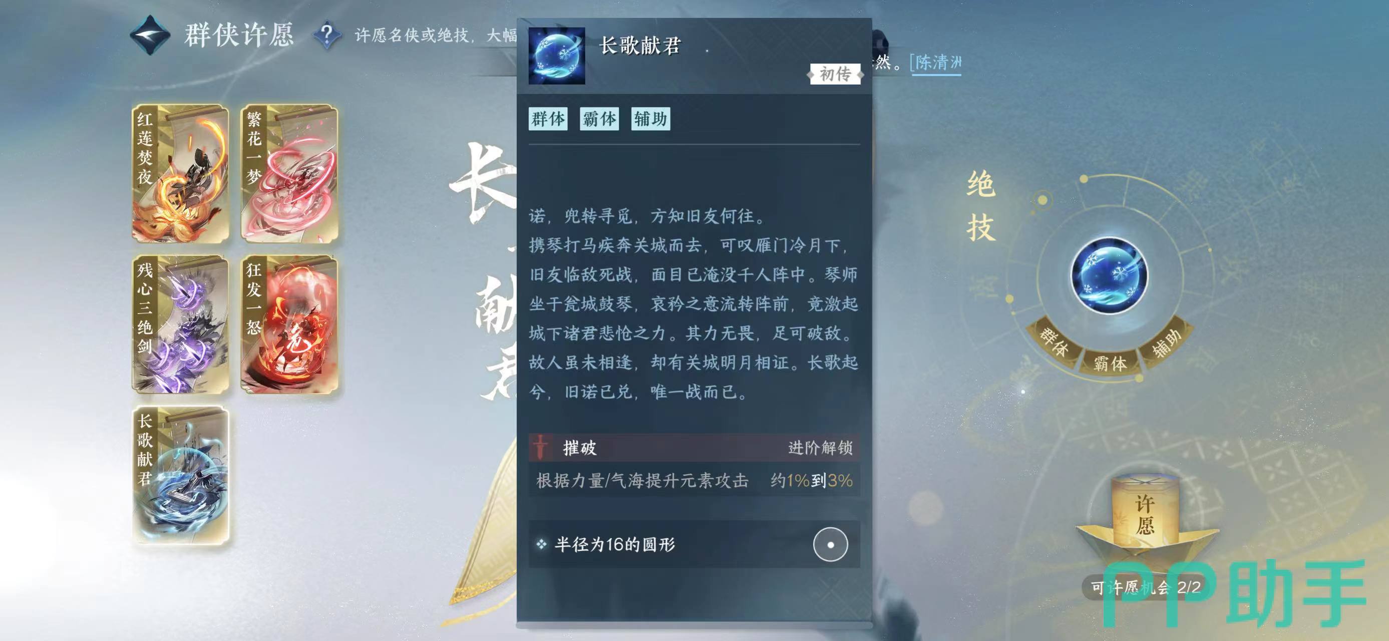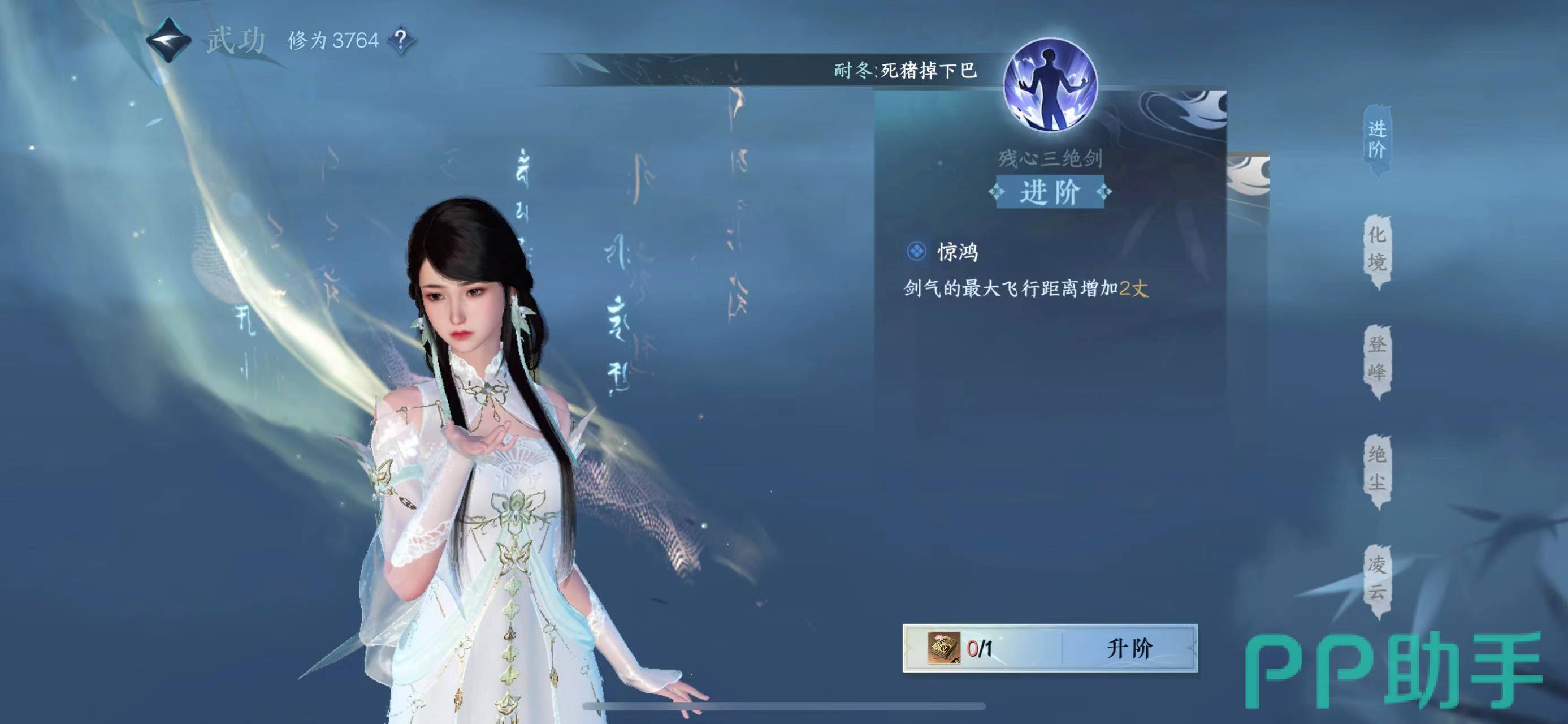 残心三绝剑:进阶效果为“惊鸿”,可以让剑气的最大飞行距离增加2丈,算是显著提升了绝技的上限,更远的射程也意味着有更多的操作可能。