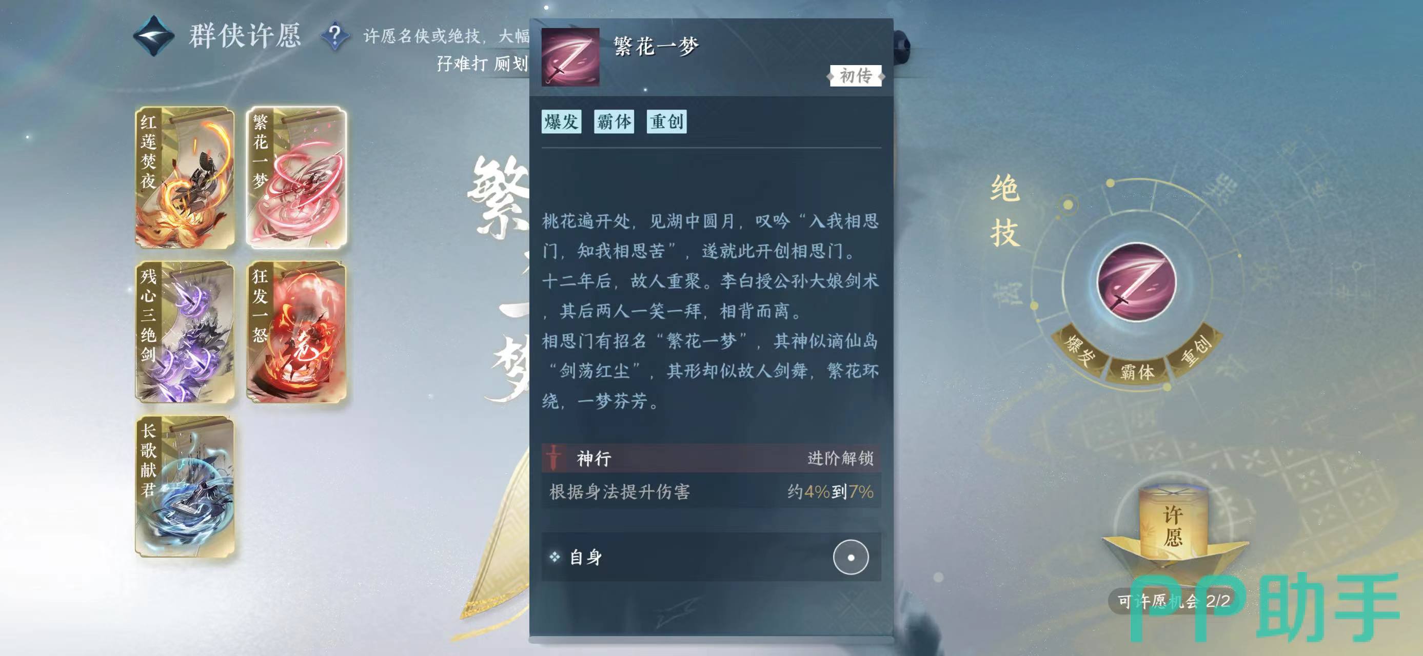 繁花一梦:进阶效果为“神行”,可以根据身法来增加额外伤害,伤害增幅从4%~7%,对比长歌献君来说,它来的更加干脆,不过因为元素攻击可以增加多个技能,所以最终收益其实半斤八两。