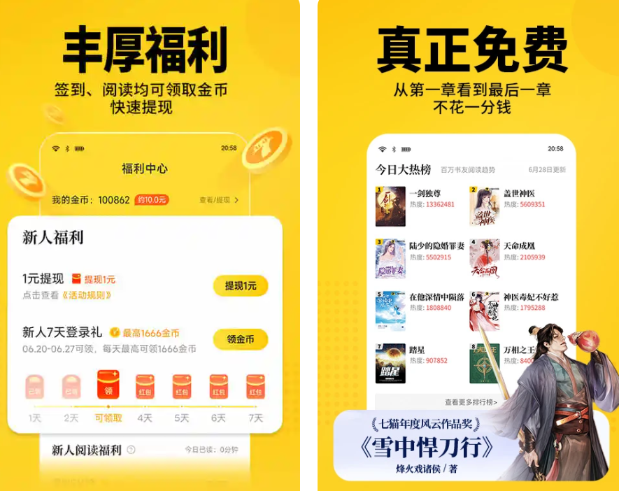 软件收纳海量题材各异的小说网文,还有特色的阅读热门榜单,如果你陷入了书荒,不妨到这款软件上看一下必读榜单,一键收获其他书迷都爱看的小说。用户每天阅读小说签到均可领取金币,兑换海量的道具与实体好礼。