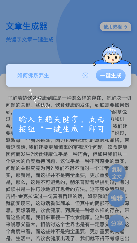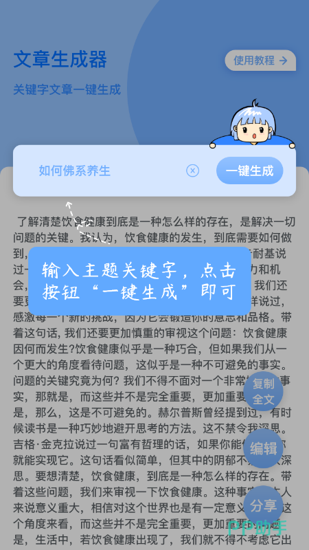 这是一款非常简单好用的文章自动生成器,通过通过输入标题内容的方式生成对应的文章,还能够对文章的内容进行粘贴,复制,编辑,分享以及转发,是一个非常神奇的文章生成工具。