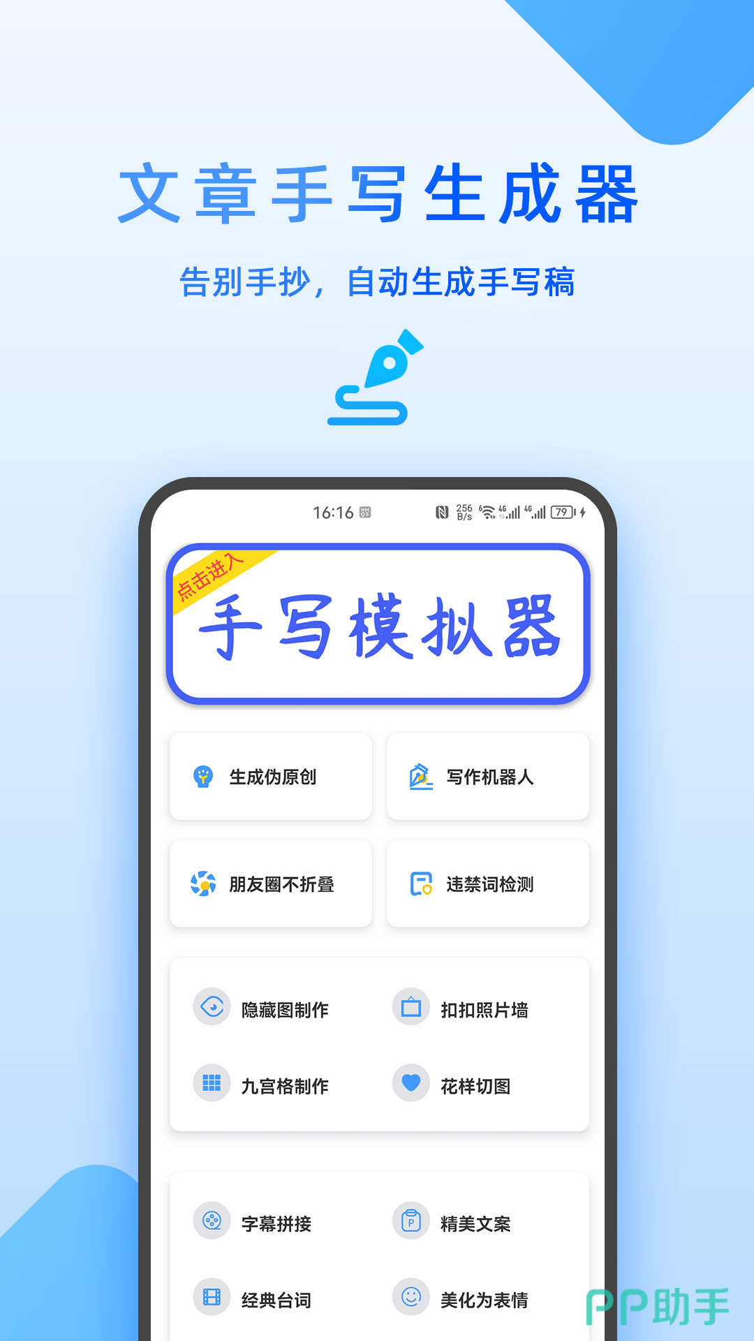在这里用户可以快速的进行文章手写,甚至还能够模拟手写字迹,轻松的粘贴复制就能够将文章生成手写体,所以用户做作业,上网课,或是在线写作文的时候,就可以用这款软件来进行手写字体的,使用是一个非常好用的帮手。