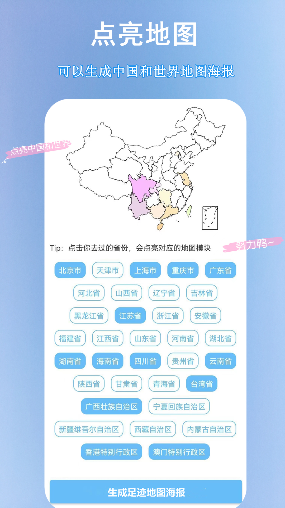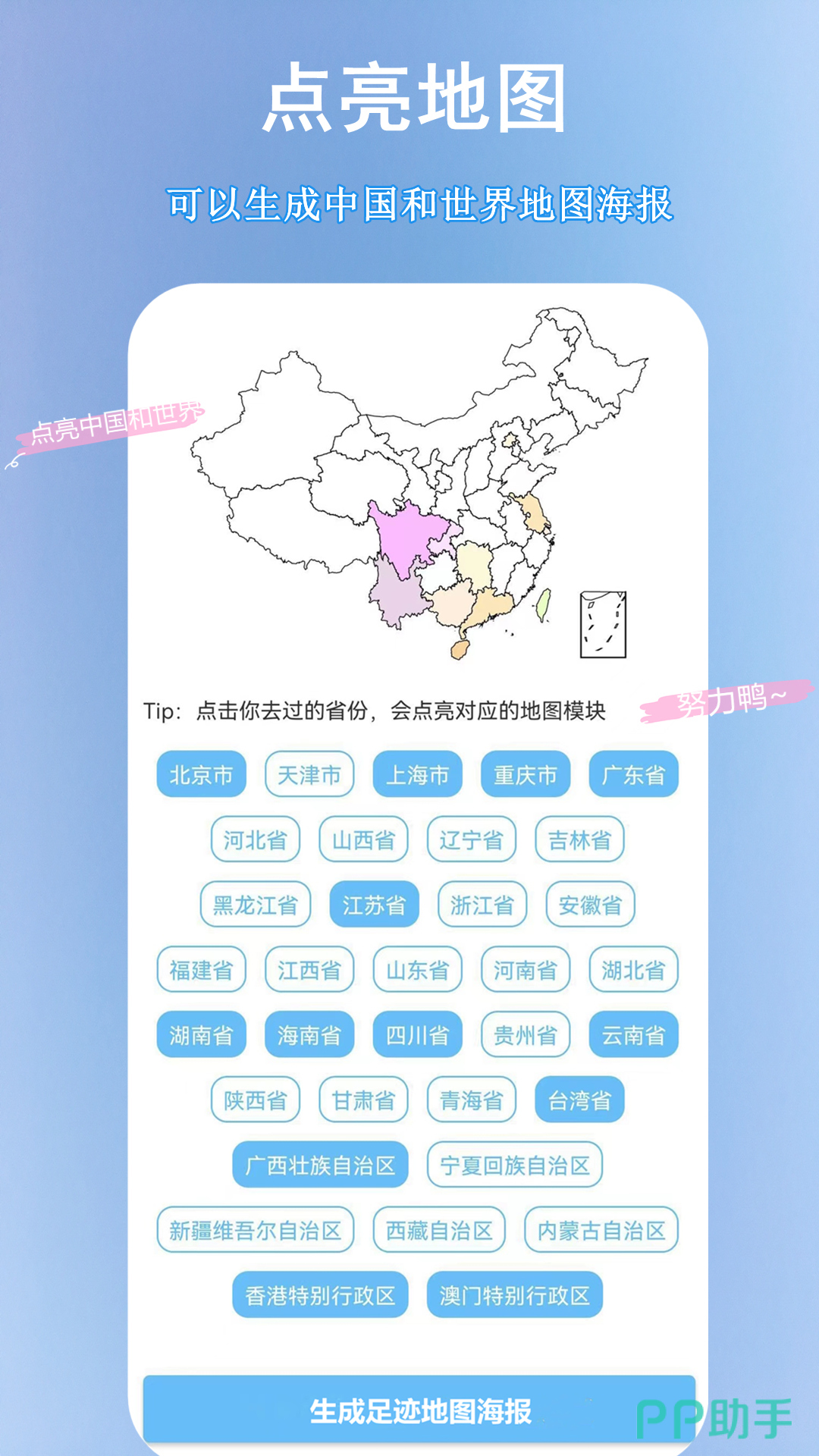 如果不想自己再费心费力去记录已经去过的各种城市和国家,那么利用这款足迹地图就能轻松实现。会自动生成出轨迹路线动画视频,随时都能拿出来看或者是分享,还会将点亮过的地方生成地图海报形式,这样很有成就感。再加上引入了PK功能,和共同好友一起去比较去过的地方,也可以在这里记录下旅行中各种心情和点滴事迹。