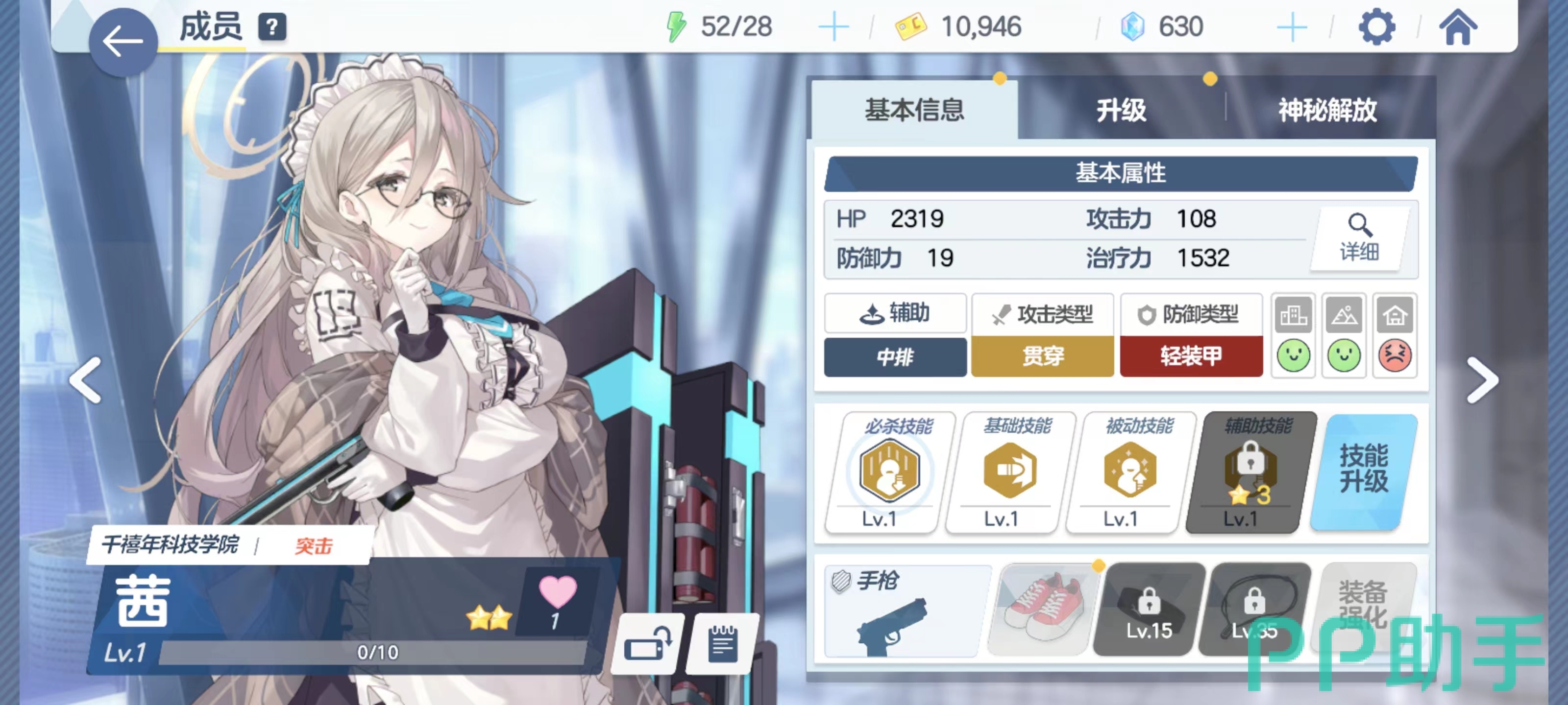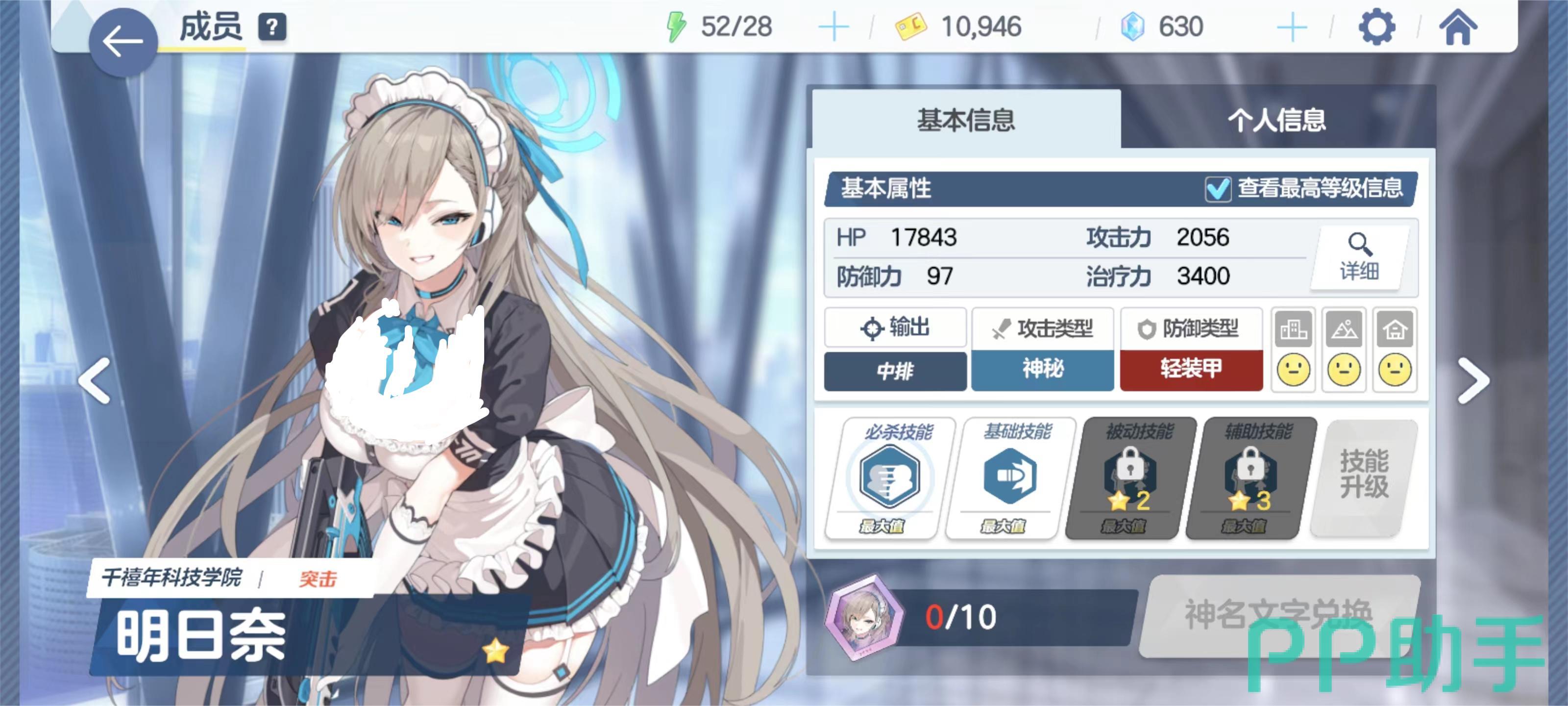 明日奈:一星的中排输出角色,虽然她的品质不高,但攻击力对比同社团的其他那些高品质输出角色,却并没有落后太多,满级两千出头的攻击配合技能被动提供的暴击和攻速加成,能够让她在实战中打出十分亮眼的输出表现,另外普通技能还可以每20秒对敌人造成一次219%~416%攻击力的单体伤害,EX技能更是可以同时增加自己的闪避值和攻击速度,可谓攻防两端都得到了完美的兼顾。