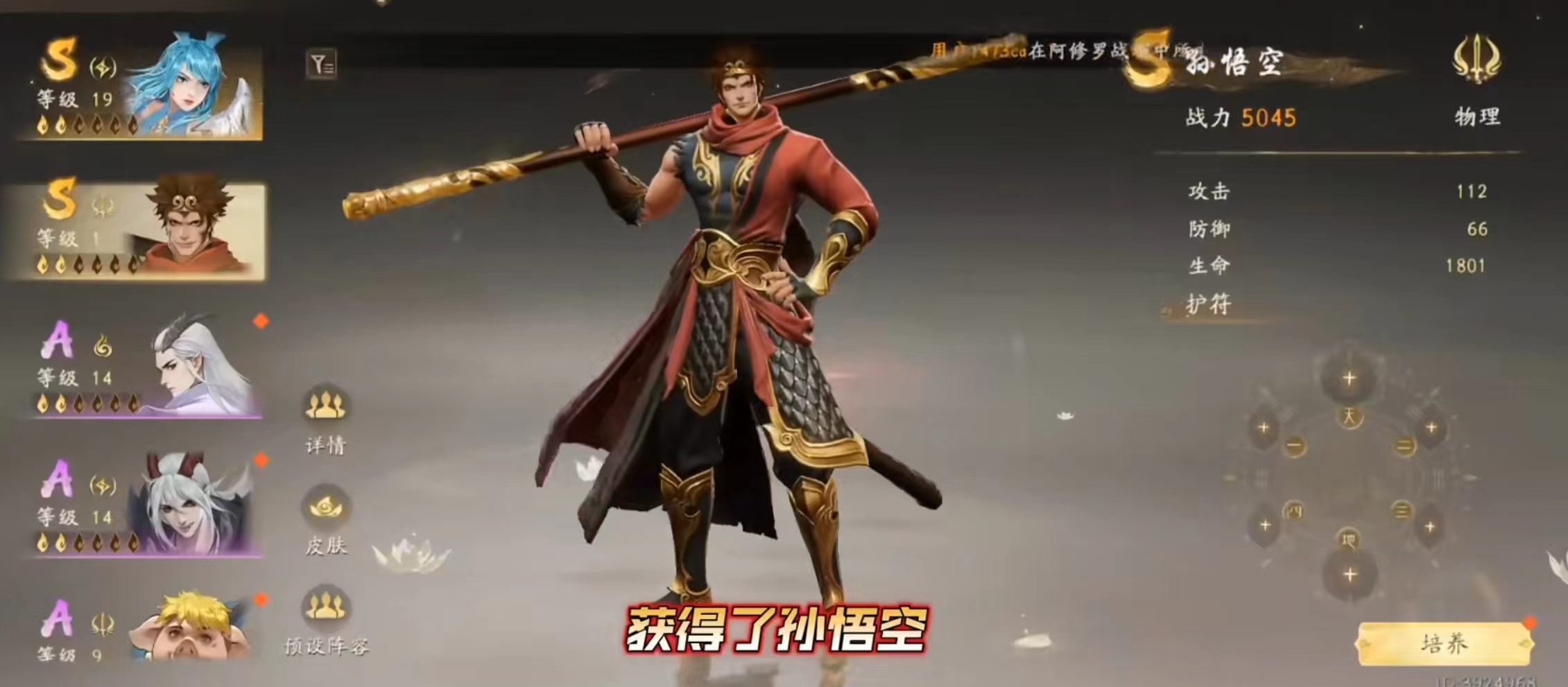 孙悟空在游戏里面的输出力可谓是非常强,所拥有的一技能是无双棍舞,当在战斗的时候,使出这个技能的话,就能够将敌人给击退,并且造成的物理伤害也是很强的,同时,还会额外附加霸体效果,这样玩家就可以更好的去释放技能了,而且在输出技能的时候也不会被其他的玩家或是敌人给打断。