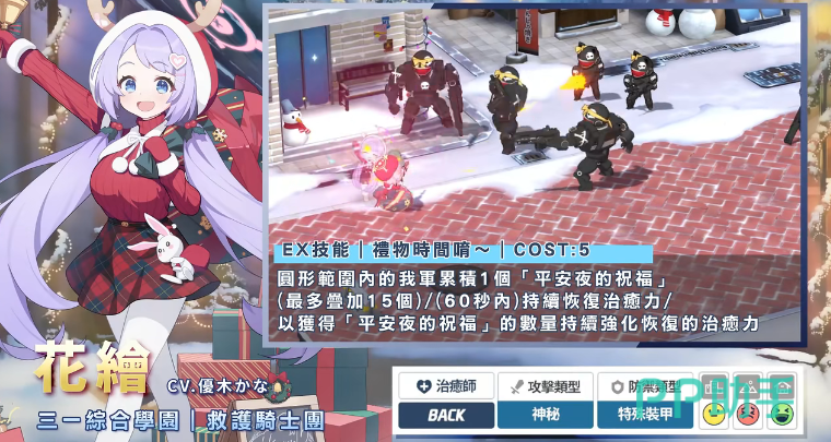 首先介绍朝颜花绘在实战中的定位。花绘(圣诞)形态在队伍中还是跟普通形态一样,属于后排治疗角色,御类型是特殊护甲。花绘(圣诞)擅长打的地形是室内,户外作战她并不适合,玩家在使用花绘(圣诞)过程中需要注意避免在户外作战,才能达到事半功倍的效果。