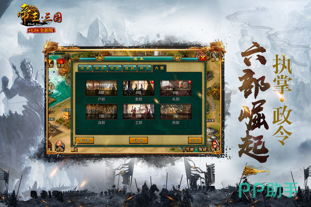《帝王·三国》是一款以经典三国小说为背景的策略游戏,玩家可以在这个游戏里扮演各路三国时期的英雄,建造城池招募军队,通过不断的提升自己的实力去获得战争的胜利,采用了3D 建模方法,让游戏更加的精美,还加入了光影技术,让游戏更加逼真,武将英雄的培养系统比较复杂,整个游戏对新手来说难度会较大,总体来说,还是非常推荐大家尝试的。
