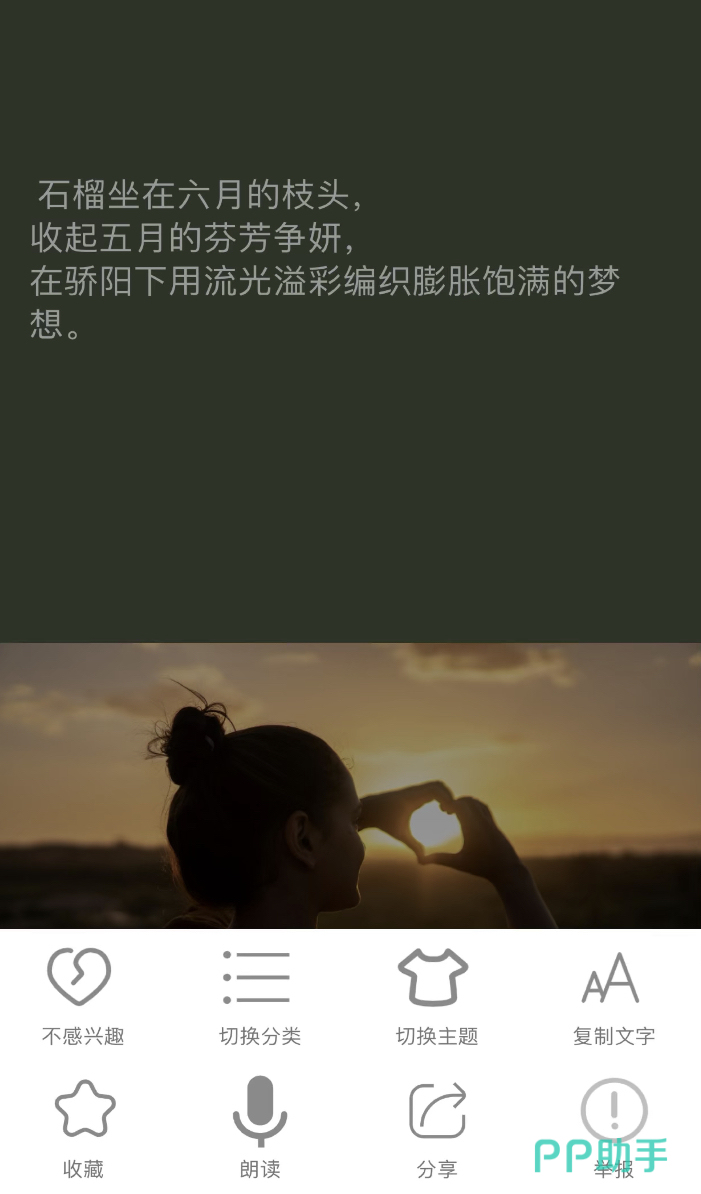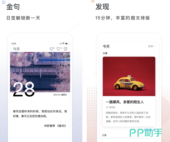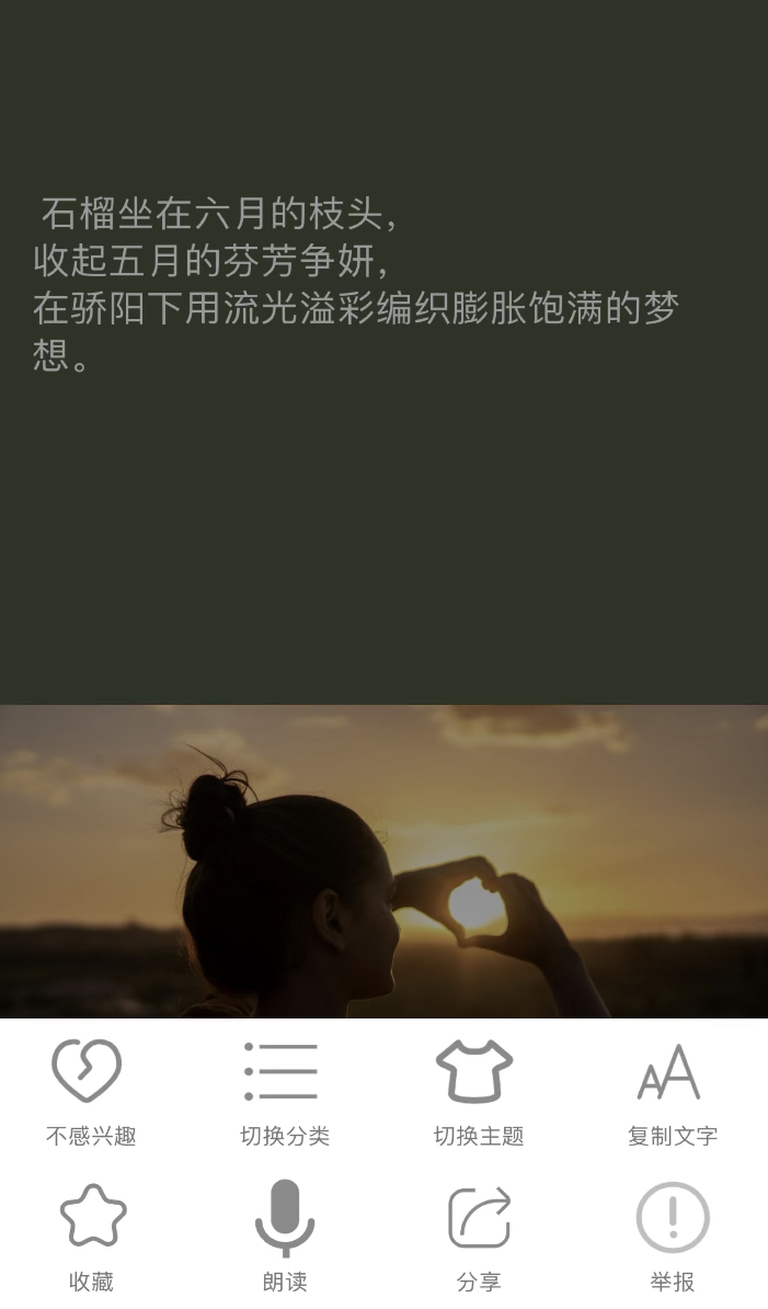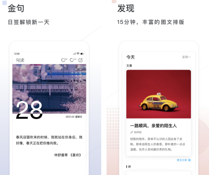 这款app画面简洁,每日一个优美的句子并配一个精美的图片,还可以随机刷新。这里的句子有的是名人名句,还有的是书中或者收录的一些特别好的话,能简单读懂他们想表达的意思,在感受文人所散发出的魅力同时充实自己,很适合摘抄或者发朋友圈还有写作文。