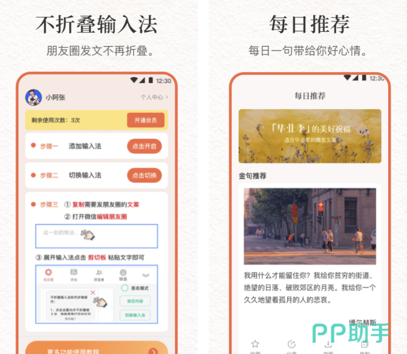 这款宝藏app是发朋友圈的必备神器,你在朋友圈经常看到的可爱的文案和各种花草表情,都是靠的这款软件。这里有很多可爱的短句,各种花样字体,还有生日祝福,跨年,旅游等各种文案,快来这里找到适合你的文案发美美的朋友圈吧。