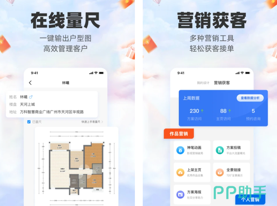 可在线导出量尺,测量家具、门框以及户型的尺寸,在线输入户型长度,还能一键输出。软件内附带有千万款海量素材案例,均可720度全景AR体验,如果你没有装修的灵感,也可以从软件里面看出自大师之手的装修方案模型。
