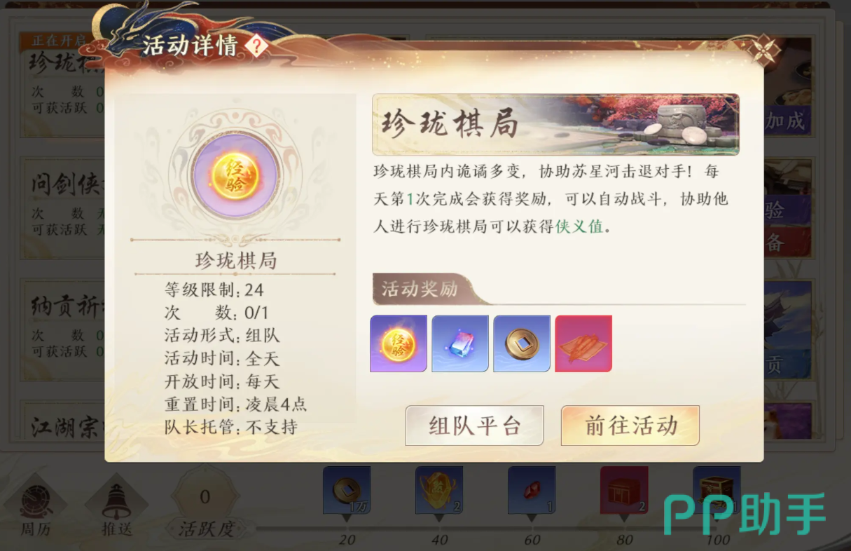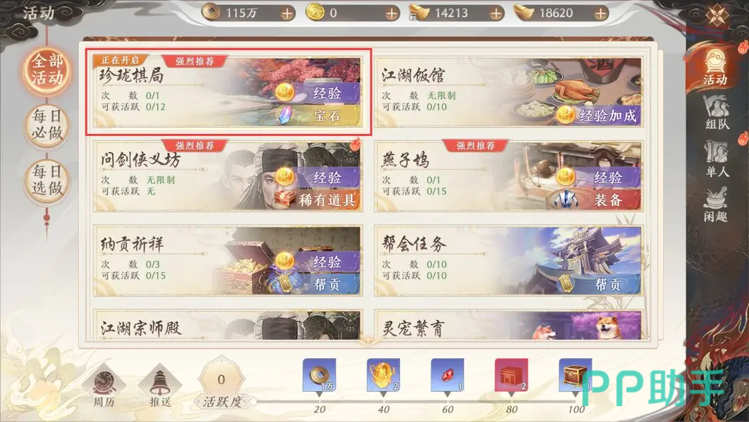虽然珍珑棋局本质上是个副本,但因为其给予经验奖励实在太过丰厚,所以官方还是将其归类在了活动当中,因此大家想挑战它的话,需要点击右边的“活动”图标,之后在其中找到它进行挑战。