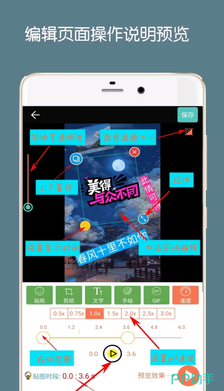五分钟的时间就让你学会gif动图制作以及制作完成一张动图,只需选中一段素材然后它就会有各个区域的提示,比如在何处添加时间以及在时间轴上做变速处理,还拥有相当丰富且全面的文字编辑以及植入系统,可分分钟让你原有的gif锦上添花,生成之后还能根据你的需求来设置fps以及占比体积大小。