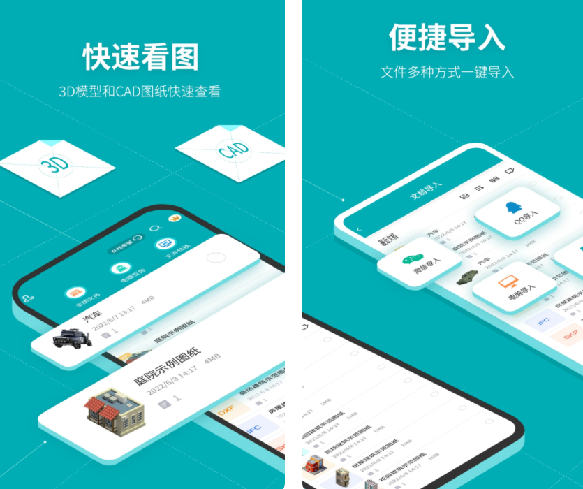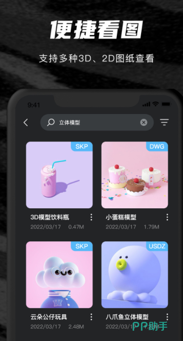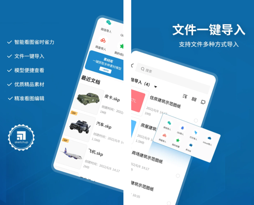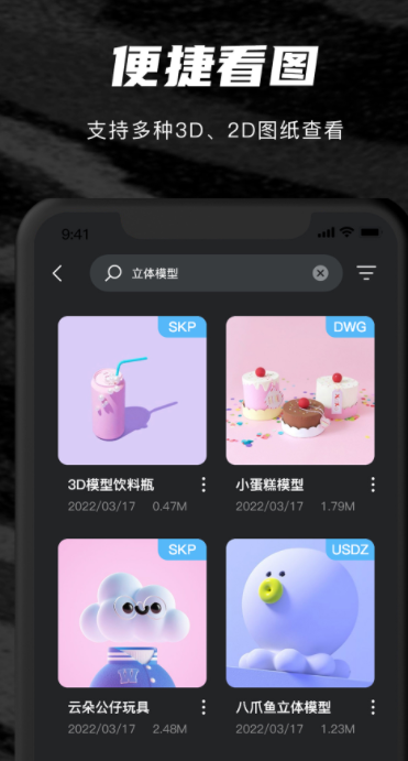 支持40多种主流3D模型以及2d图纸格式导入,看图能力较强,而且加入CAD文件后可以进行单点以及多点的触控,更有海量SU模型库让你下载学习,有各种卡通人物、动植物、建筑物等模型,360°高清查看模型各个角落,不管你是在学建模还是需要做建模都适用。