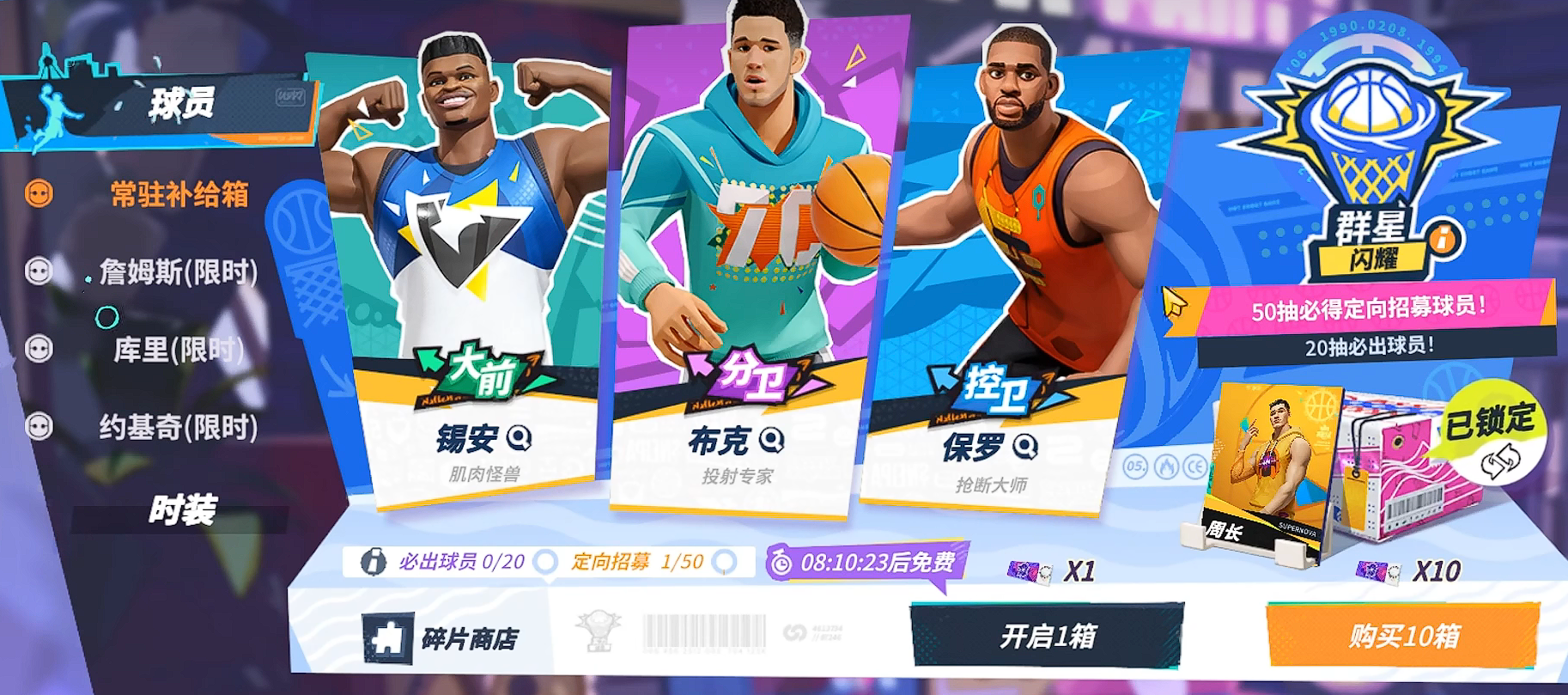 那对于新手玩家而言,游戏中还有着相当不错的常驻补给箱机制。这个补给箱概率将比常规的限时up要出货概率提升很多,其保底定向招募也从80变成了50。基本上玩家们可以选择自己喜欢的角色后,50抽便可以必定获得定向招募的球员,20抽必出一个紫,也相当于我们抽完这个池子,50抽左右必定出一个金一个紫。