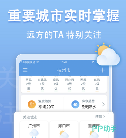 手机上拥有这款软件,可准确的显示当天的天气,还会根据具体的情况进行更新,也会显示未来几天的预报。如果自己最亲的家人没有和自己生活在同一个区域,软件还有重要城市实时掌握的内容,比如家人所在的城市就可进行特殊的设置。在家里面就能了解对方所在城市的降水情况以及温度,提醒对方应该穿什么衣服,更有利于提升彼此之间的感情。