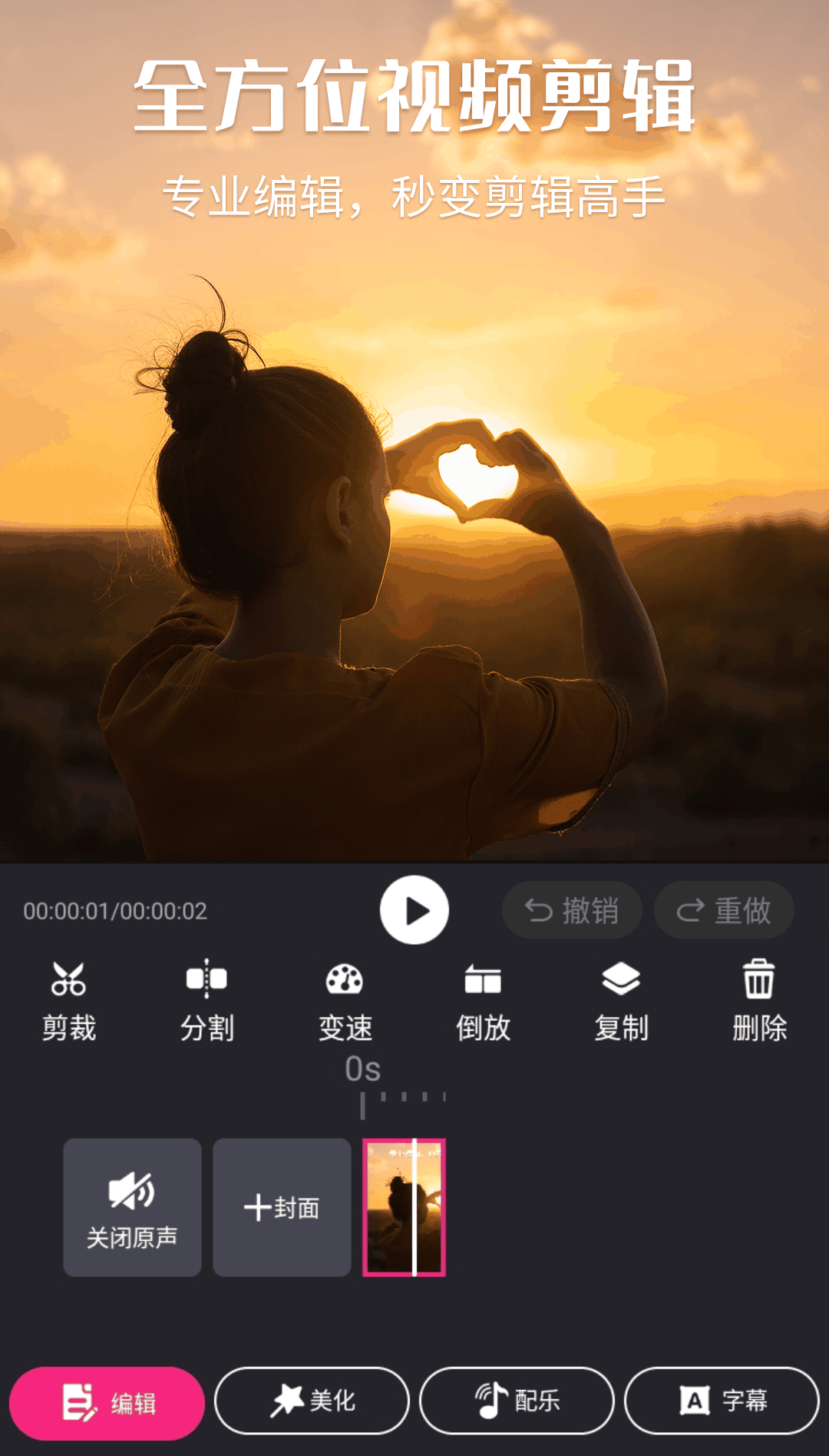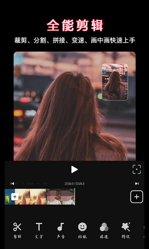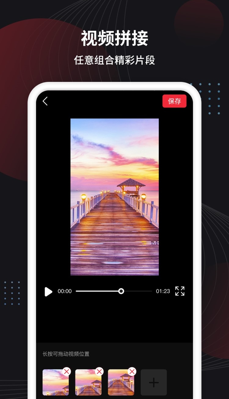视频剪辑大师就是对视频本身的一些剪辑,比如将多个小的短视频合并成一个长的短视频,或者将一个长的短视频分成若干个小视频,给视频添加背景音乐、倒放、混声、卡点等等。