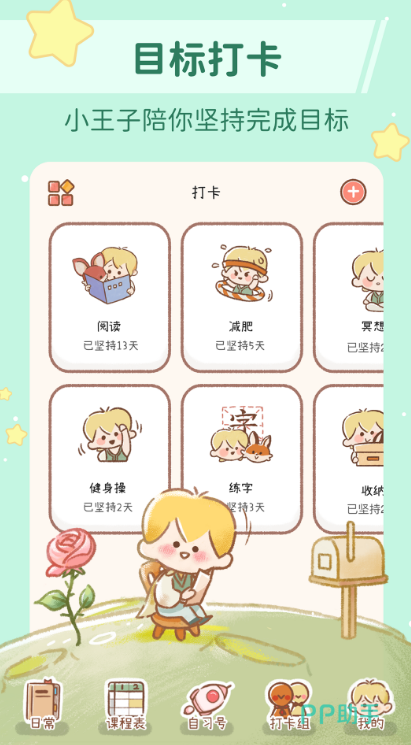 女孩子都喜欢比较好看的app,然后通过自己的规划来布置,形成独一无二的风格,记录每天的日常行为习惯,目标打卡可以随意设置,小王子会每天陪着你坚持完成目标,里面还有星球自习室,让你的自主力与动手能力有着直线的提升,一个人打卡无聊可以拉着好友组队,共同打卡。