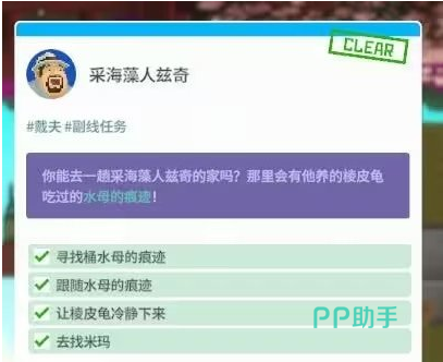 支线采藻人兹奇的相关任务一共有四个,第一个是寻找桶水母的痕迹,第二个跟随水母的痕迹,第三个让棱皮龟冷静下来,最后一个去找米玛,其中与采藻人兹奇家位置息息相关的任务就是让棱皮龟冷静下来这个任务。