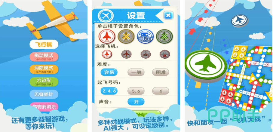 游戏画面很简洁纯粹,是用各种颜色不同的方块制作成棋盘,再搭配五颜六色的飞行棋,看着就让人心情很好。玩法模式有很多种,可以一个人玩,也可以多个人一起玩,开始游戏后,用骰子扔出相应的点数,决定行走的步数。如果飞机降落在和自己颜色一样的方块格子中,就可以跳到下一个颜色相同的方格里面,如果和对手的飞机落到一个格子当中,就会将先到的那一方飞机打回原点重新开始。