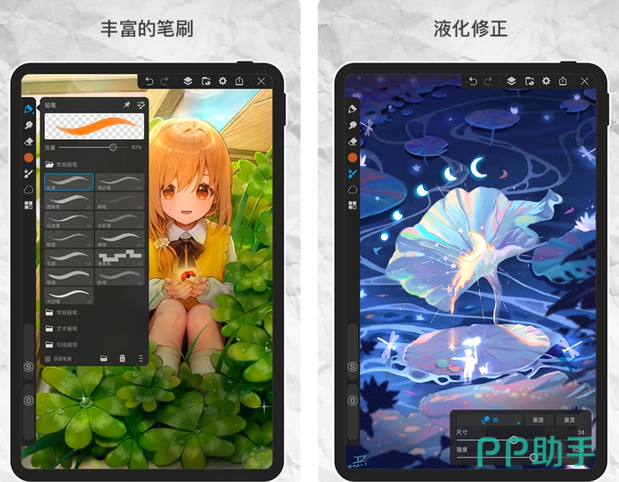 有多种类画漫画的画笔,从铅笔、炭笔到墨水笔,适合不同作画风格。可以导出不同图片格式,方便你在电脑上进行二次编辑,整合或者拼接长条漫画都适合。内置有自定义原创画笔功能,可以导入各种形状,画树木、建筑物不费劲,快来创造你的全新创意世界。