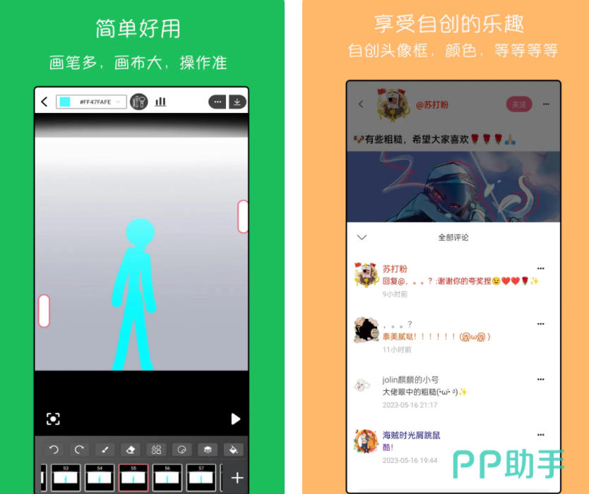 在线创作漫画动画的软件,用户只需创作关键帧的画面,就可以利用软件里面的强大连贯功能,将多帧画面生成gif动图,帮你轻松将漫画动起来。在线画布足够大,有方便你绘画的多种类画笔,手指双手放大细微操作画每一笔。新增加的骨骼动画,可以绑定人物骨骼进行更加精准的动作移动,快来软件里面激发你的创造力。