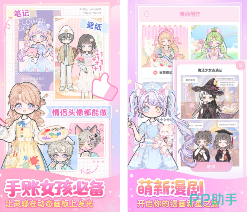 软件里面有非常多二次元萌动卡通人物素材,用户可以制作不同造型的主角,配上有趣的气泡文字连贯而成漫画。在漫画模板上,有横版、斜格、特写镜头模板,在创作社区上看到好玩的漫画,还能使用做同款功能,获取其他人的漫画模板,快来开启你的漫画新星之旅吧。