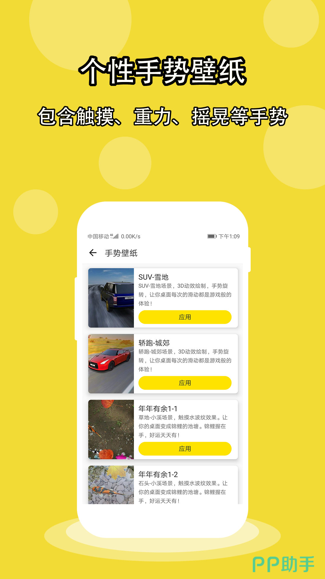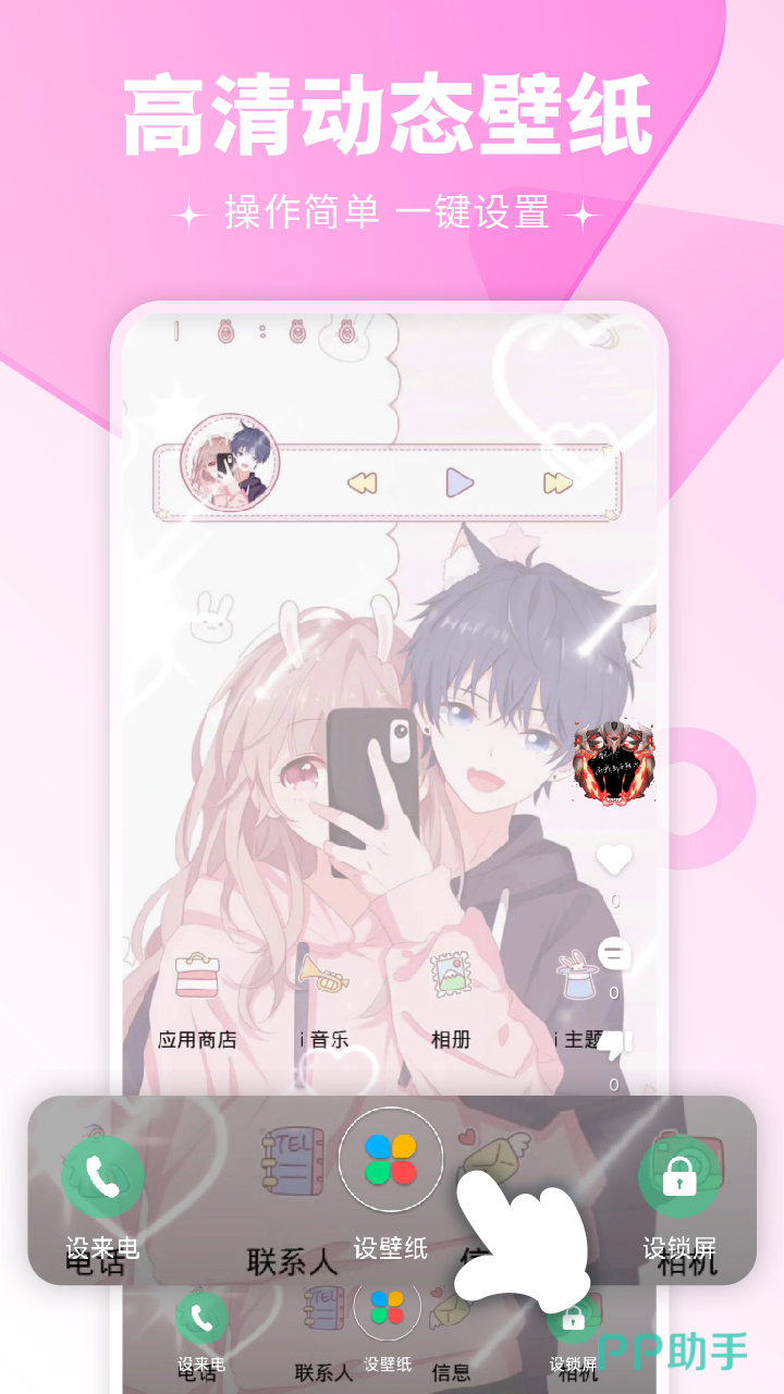各种动态壁纸,静态壁纸应有尽有,喜欢壁纸的用户可以直接选择手机上的壁纸模板,之后就可以进行自助DIY,Gay出来的图片可以随时下载并使用在任何一个界面上,包括聊天界面,也包括锁屏界面和手机的,屏保都可以使用这个图片。