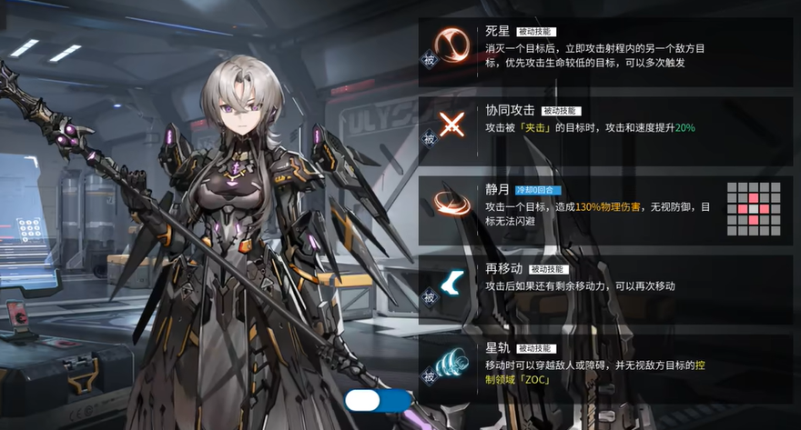 天狼星的第二被动技能名为“协同攻击”,顾名思义,当周围有队友进行攻击的时候,天狼星在触发与其的连携攻击时,会获得速度和攻击力同时提高20%的buff;而她的第三被动“再移动”可以使其在完成攻击之后还能再次移动;而她的天赋被动技能“星轨”则可以让这名角色可以无视障碍和敌人的阻挡进行移动,使其可以在敌人眼皮底下逃走,让敌人望洋兴叹。