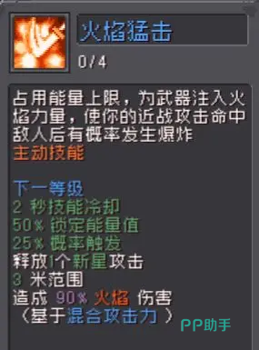 【火焰猛击:火焰骑士会占用能量的上限,为手中的武器灌入火焰的力量,对3米范围内的敌人造成90%的【火焰】伤害,同时近战攻击命中后有25%的概率触发爆炸效果,这个技能需要2秒的冷却时间,50%的固定能量值,这个技能的伤害虽然不是很高,但是因为其技能强度在实战中有比较突出的表现,可以作为优先技能来升级。