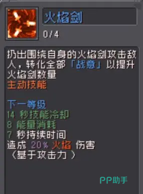 【火焰剑】:火焰骑士会扔出环绕在自身的火焰剑吗,并对敌人造成20%的【火焰伤害】,这个伤害会持续7秒钟的时间,技能需要14秒的冷却时间,共计8点能量点,在开启技能后会转化自身储存的【战意】,然后提升火焰剑的数量。这个技能可以优先进行升级,因为虽然是战士进行转变而来的,但是这个角色没有什么自保能力。