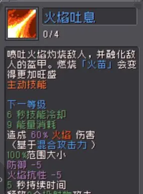 【火焰吐息】:火焰骑士会喷吐出火焰灼烧敌人毛病对敌人造成60%的火焰伤害,同时会融化敌人的盔甲,这里的意思是会减少敌人5点防御属性和5点对火焰伤害的抗性,会持续5秒钟,这个技能需要6秒冷却和9点能量。