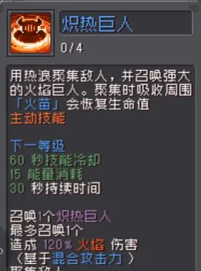 【炽热巨人】:火焰骑士会用热浪对附加的敌人进行聚集控制,并召唤出 一个非常强大的火焰巨人,巨人会对周围的敌人造成120%的【火焰】伤害,伤害会随着基础攻击力而提升。聚集敌人的时候会吸收战场上留下来的【火苗】,会根据【火苗】的数量回复自身生命值。
