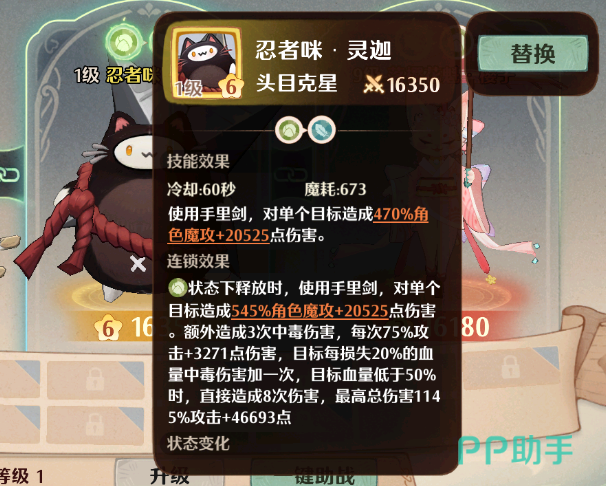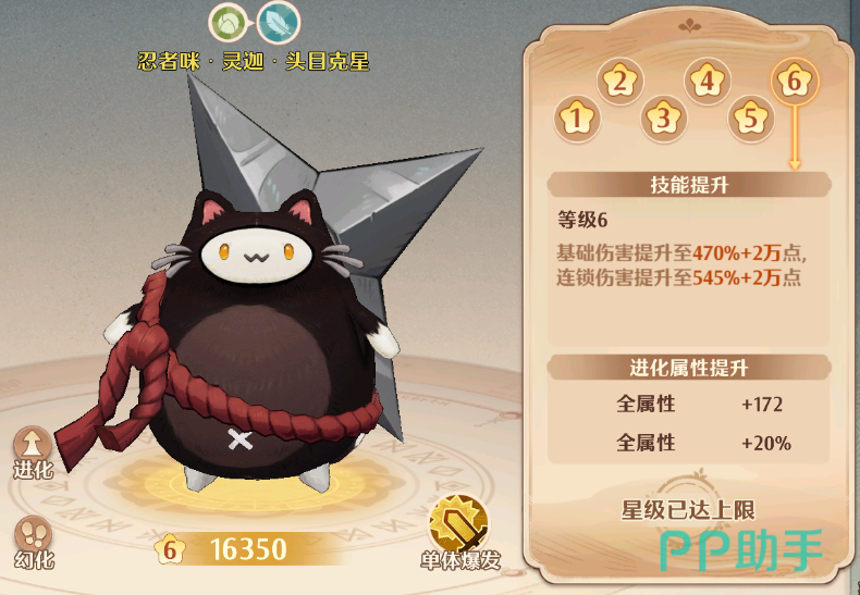 在满星的时候会提升450%的基础伤害,同时连锁伤害提升至415%,两个技能的固定伤害提升1.8万,而且获得最终的强化,在攻击敌人的时候,如果敌人血量低于50%的时候,伤害会产生额外的中毒次数,最高叠加8次。进化后的全属性会增加16%。这个宠物目前是游戏中比较稀有的了,强度方面肯定是可以排上名的!