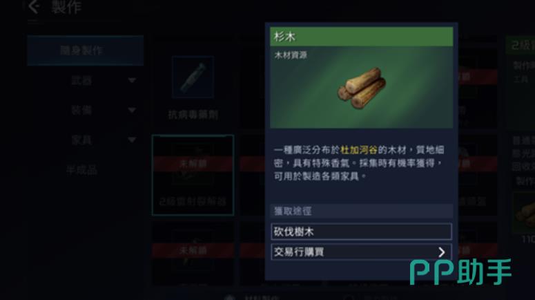 这种材料的要求并不高,因为在游戏初期,可以大规模的采集。木材和岩石都是常见的资源,除了这些之外,我们还可以去杜加河流域砍伐冷杉,那里到处都是冷杉。事实上,在这个世界上,有很多的武器、工具和装备,只要满足一定的要求,就可以通过‘随身制造’来制造。